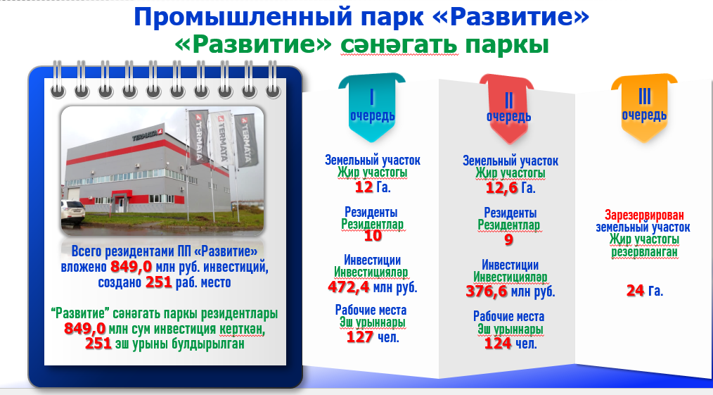 «В нашем городе наблюдается рост обращения к нам предприятий, желающих открыть свое производство на территории промышленных парков. Это хорошая тенденция», - констатировал Наиль Магдеев. Так, 10 потенциальных резидентов планируют открыть свои производства в промышленном парке «Развитие». При этом 1 и 2 очереди парка полностью заняты.