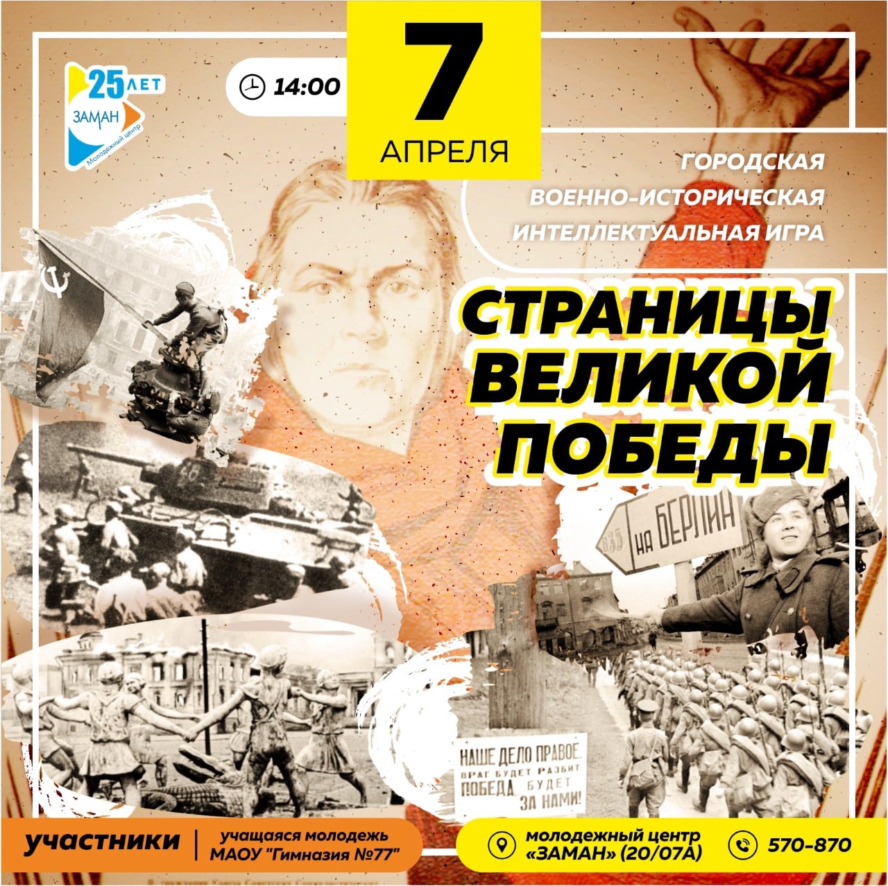 В целях формирования гражданственности, высокого патриотического сознания на примерах героизма и отваги нашего народа на протяжении всей Великой Отечественной войны, молодежный центр «Заман» при поддержке управления по делам молодежи Исполнительного комитета проводят серию Городской военно-исторической интеллектуальной игры «Страницы Великой Победы», посвященной 77-летию Победы в Великой Отечественной войне, среди учащейся молодёжи общеобразовательных школ города.