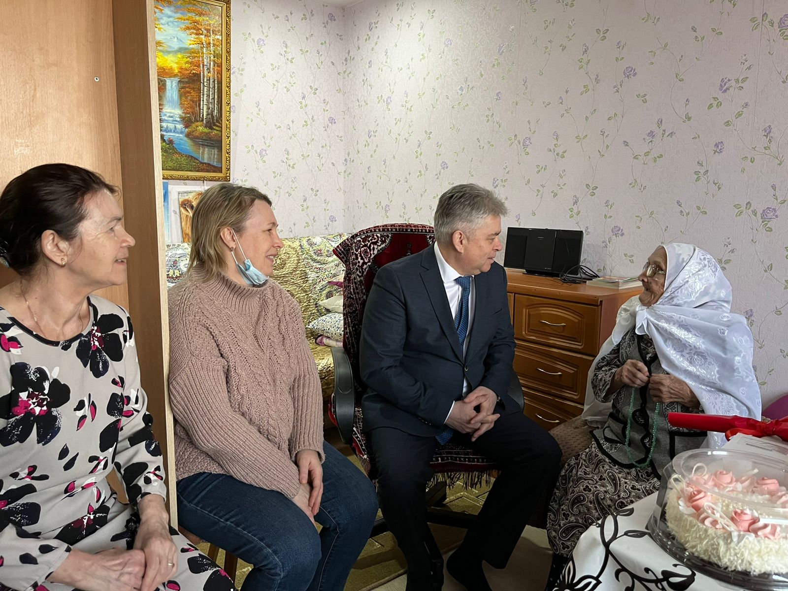 От имени Президента Российской Федерации Владимира Путина и мэра города Наиля Магдеева юбиляра поздравили глава администрации Автозаводского района Винер Харисов. К поздравлениям присоединилась председатель ТОС «Уютный» Марина Залялиева.