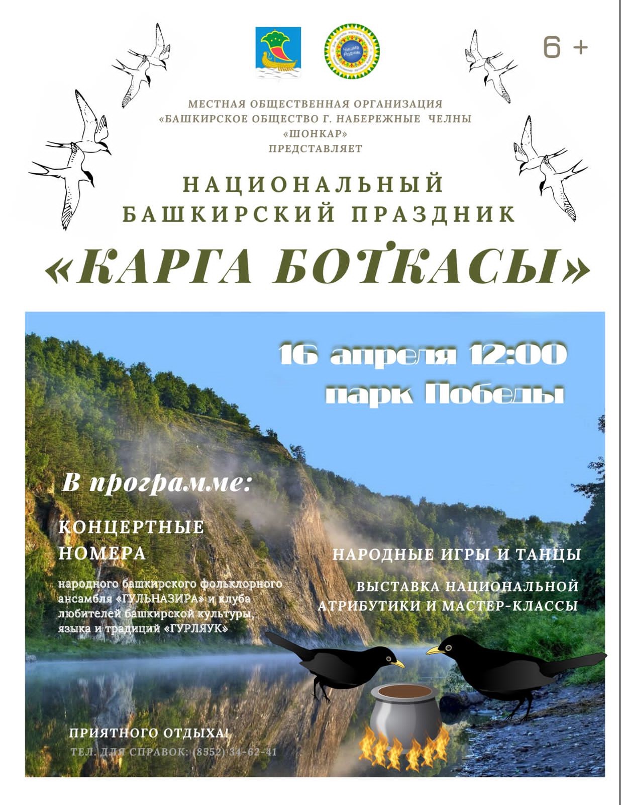 В Набережных Челнах 16 апреля в 12:00 в парке Победы состоится национальный праздник «Карга боткасы». В празднике примут участие артисты башкирской национально- культурной автономии «Шонкар» и Дома Дружбы народов «Родник» при поддержке управления культуры Исполнительного комитета города.