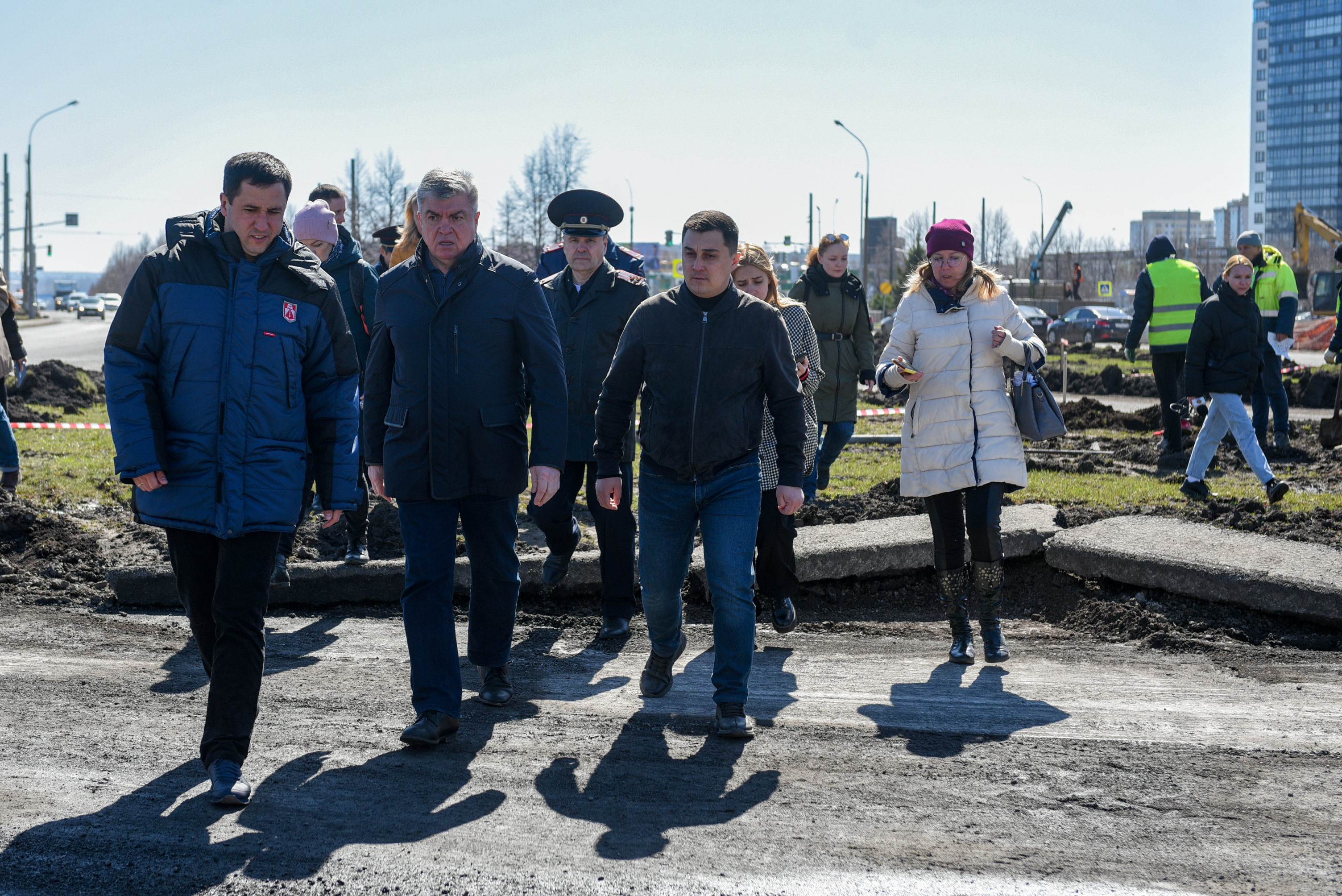 Глава города обратил внимание дорожников на состояние дороги и сделал замечание, что бортовой камень, грунт необходимо будет убрать.