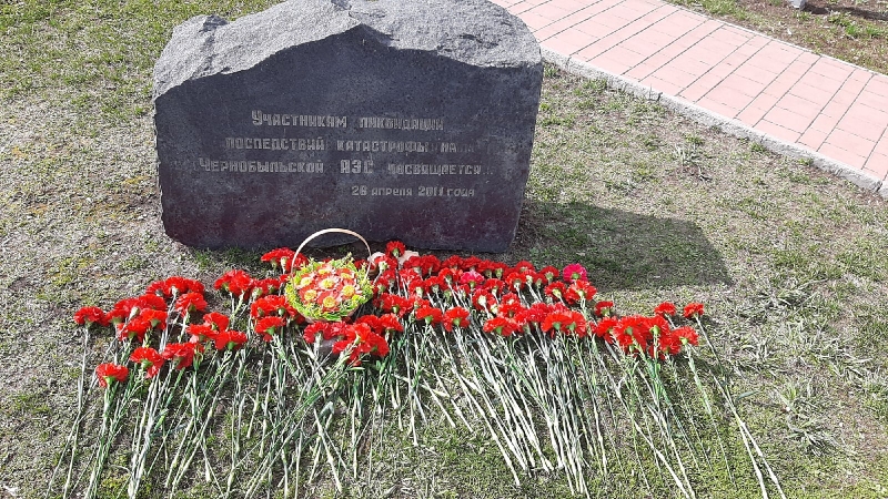 Участники церемонии почтили память погибших в ликвидации аварии Чернобыльской АЭС минутой молчания и возложили цветы к памятному знаку героям Чернобыля.
