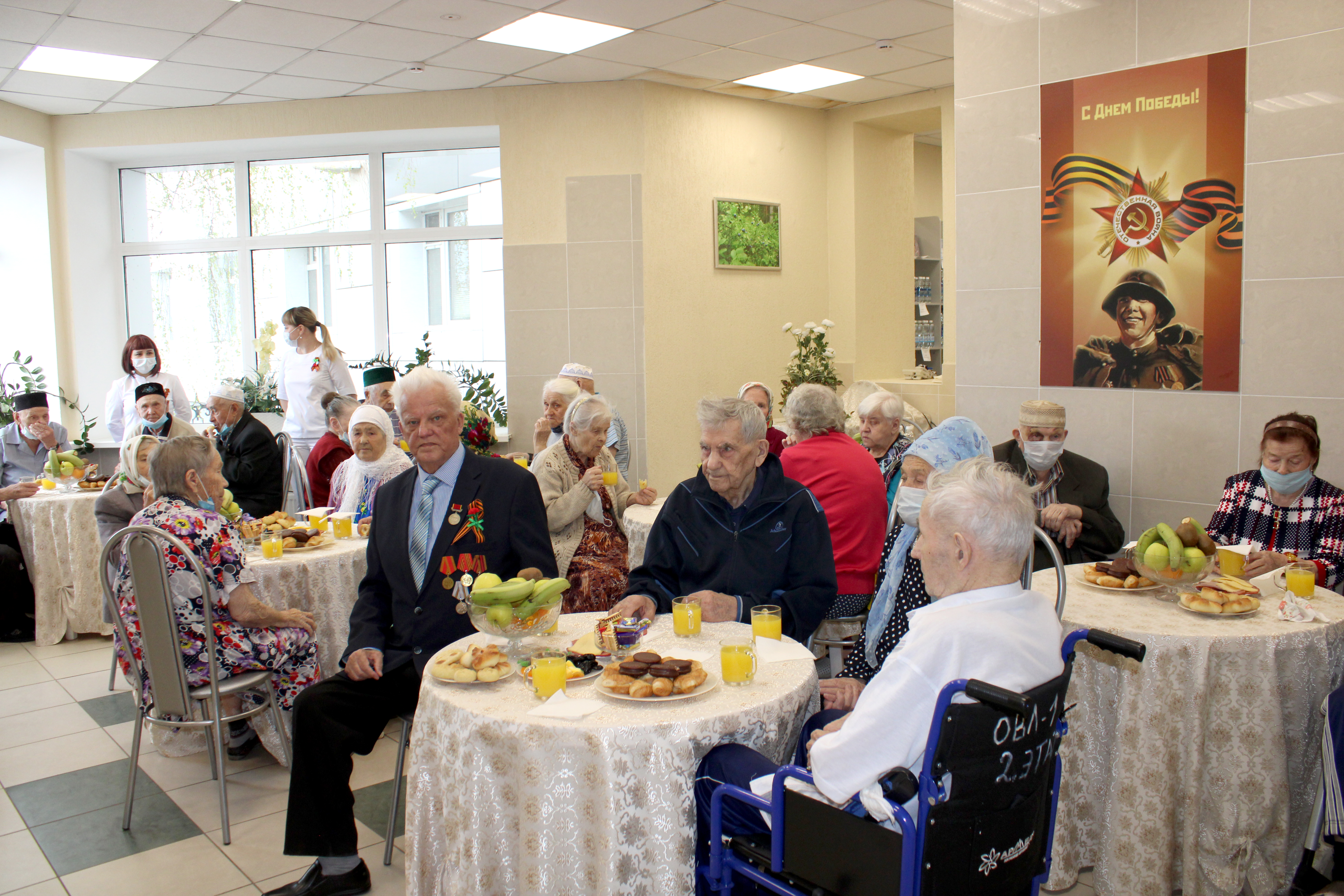 Для пациентов, которые проходят лечение на данный момент, в буфете организовали праздничные столы с угощениями и украсили в тематике предстоящего праздника. Помощь в организации праздничных столов оказал торговый центр «Торговый квартал». Девушки-медсестры в военной форме встречали гостей и помогали ветеранам.