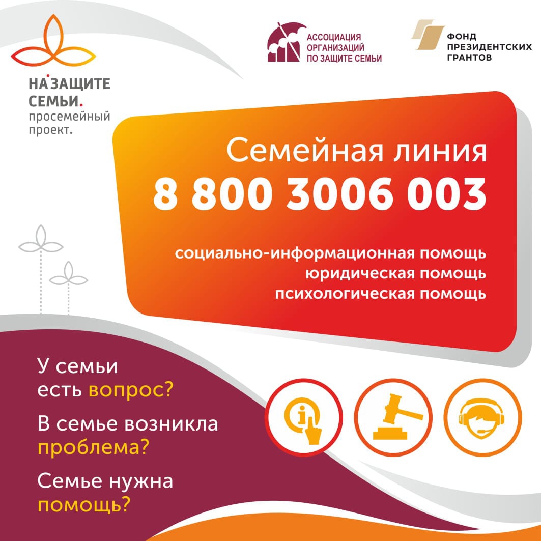 Уполномоченный по правам ребенка в РТ Ирина Волынец напоминает, что в стране в рамках реализации семейно-демографического проекта "На защите семьи и детства" создан телефон для родителей. В рамках проекта на все субъекты РФ открыт федеральный номер Семейной линии 8-800-3006-003, который работает ежедневно и круглосуточно, предлагая заявителям безвозмездную социально-информационную, консультационную, юридическую и иную помощь.