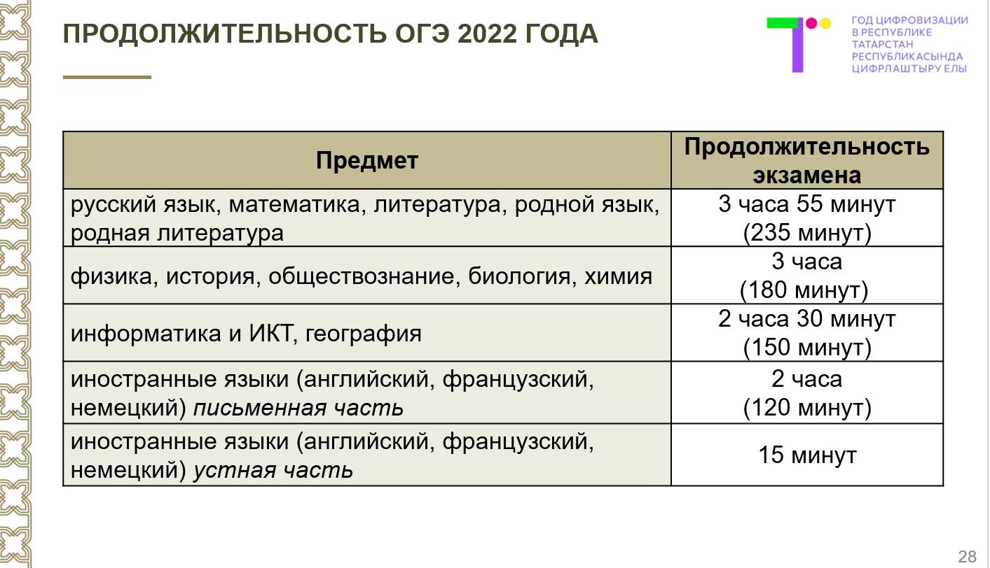 Продолжительность некоторых экзаменов сократилась по сравнению с 2021 годом. Как отметил Ильсур Хадиуллин, это связано с облегчением заданий. Так, на 55 минут сократилось время экзамена по истории, на 25 минут - по обществознанию. Время выполнения заданий устной части работы по иностранному языку увеличилось на две минуты и составляет 17 минут.