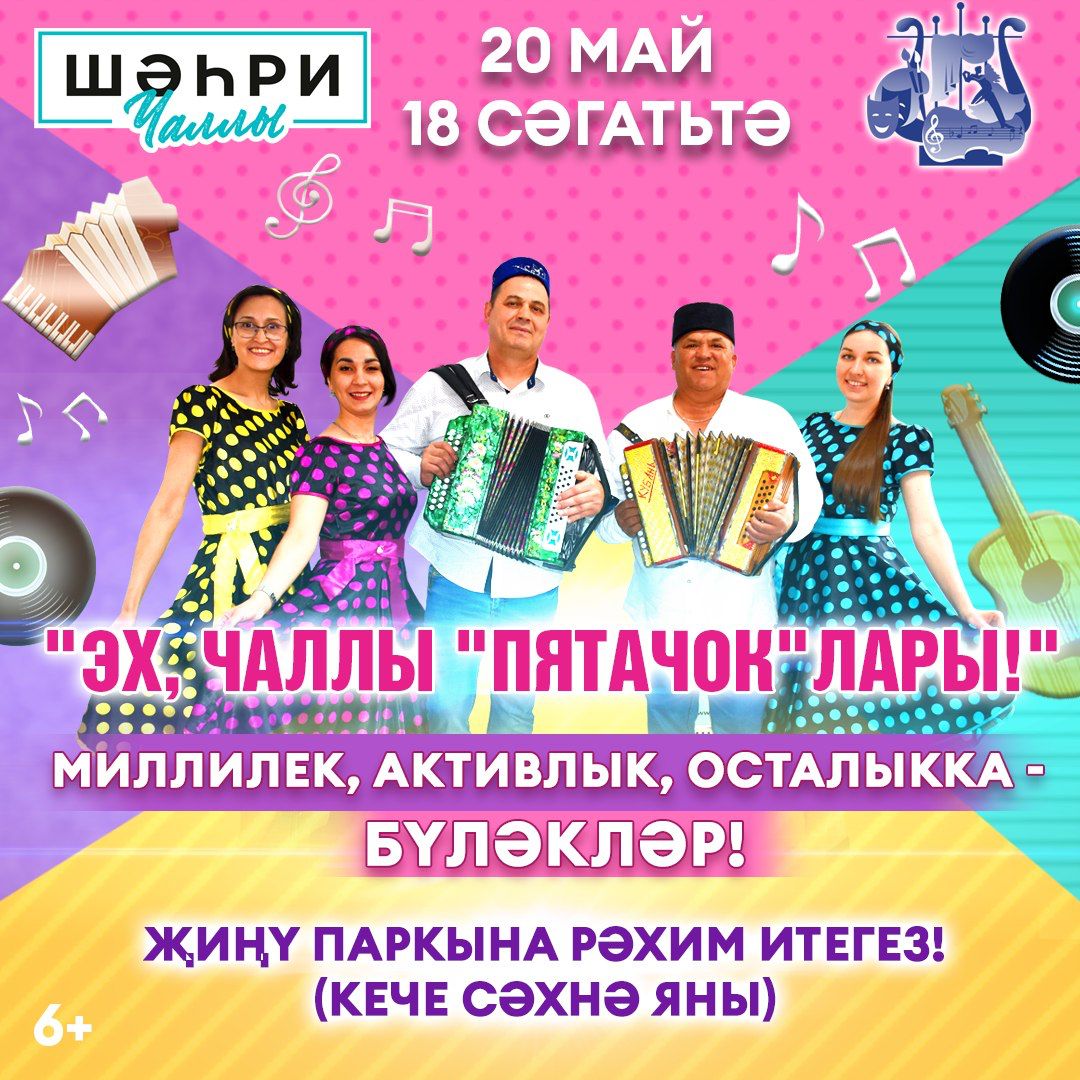 20 мая впервые в нашем городе с 18:00 до 20:00 в Парке Победы (малая сцена) пройдёт вечер «Эх, Чаллы пятачоклары». Организаторами выступит управление культуры исполнительного комитета совместно с редакцией «Шахри Чаллы». Ведущим мероприятия будет Резеда Ганиева. Прозвучат песни в исполнении Ильнура Гумерова и Ринаса Ахметова.