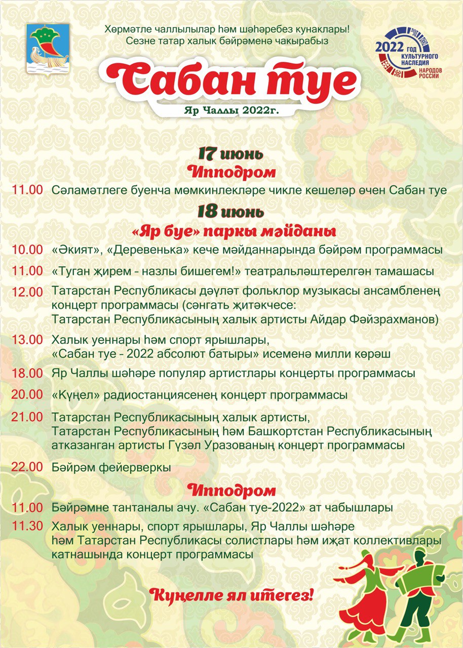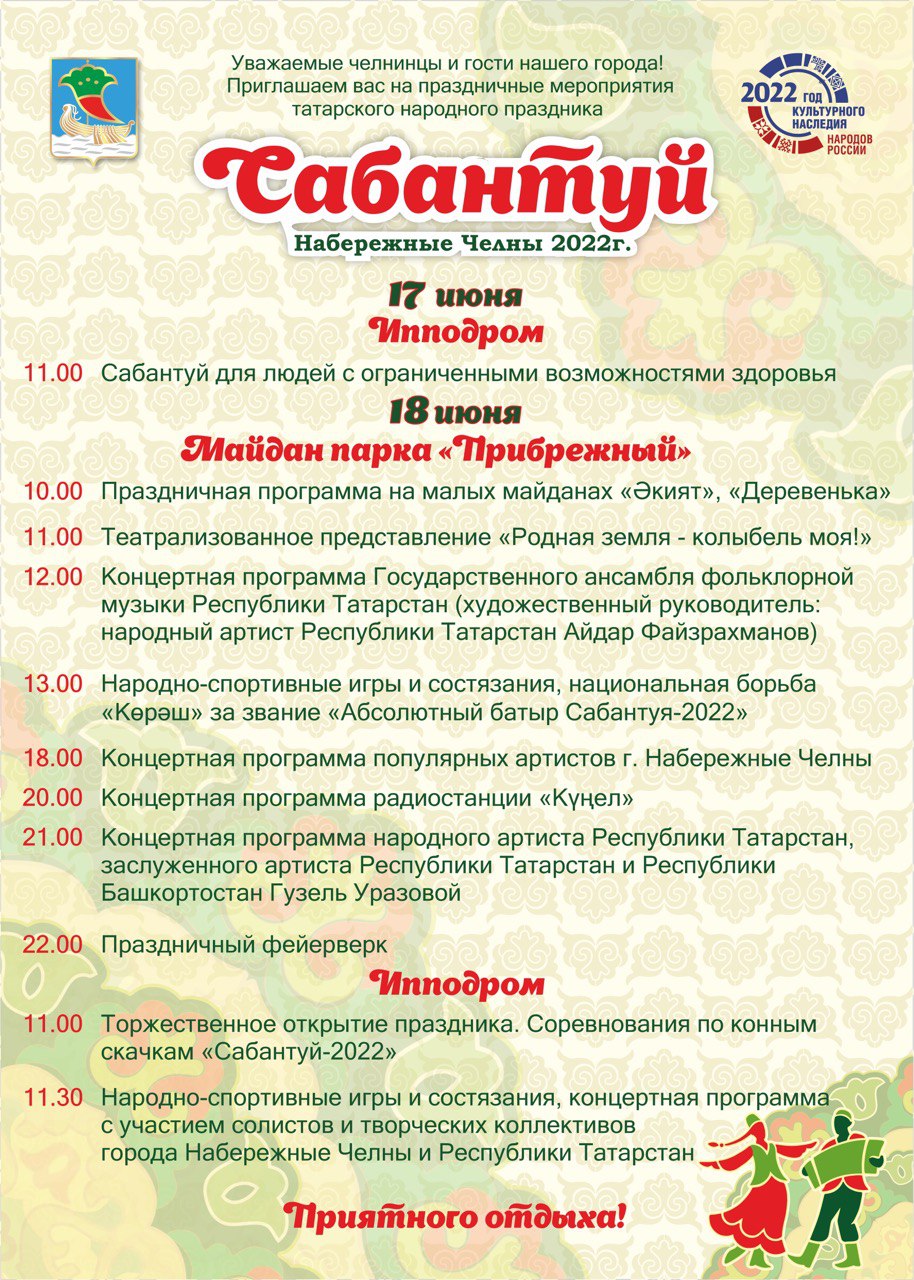 «Сабантуй-2022» в Набережных Челнах состоится 18 июня. Традиционно празднование развернется на двух площадках города: майдане парка Прибрежный и Ипподроме.
