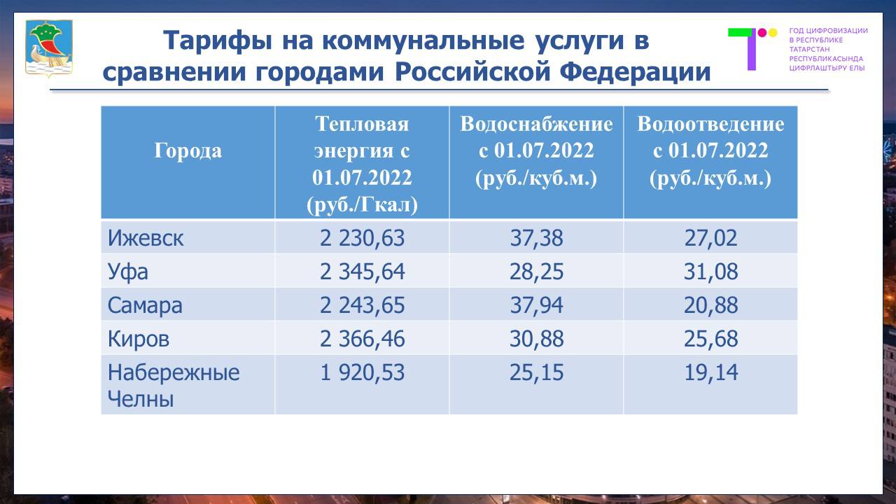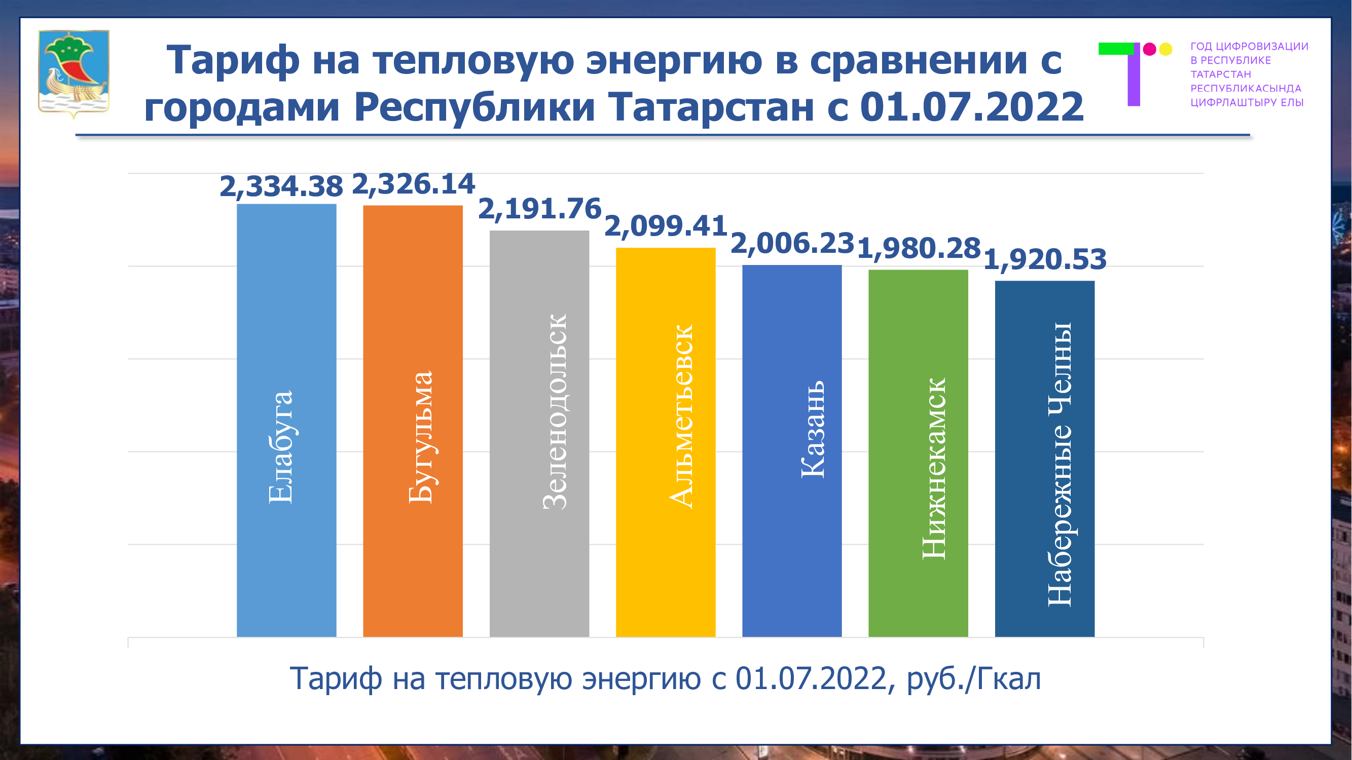 С 1 июля стоимость за 1 гигакалорию тепловой энергии составит 1 920,53 руб., тариф увеличится на 9,2% по сравнению с I полугодием 2022 года. Тариф по тепловой энергии в городе Набережные Челны остается одним из самых низких по сравнению с городами Республики Татарстан.