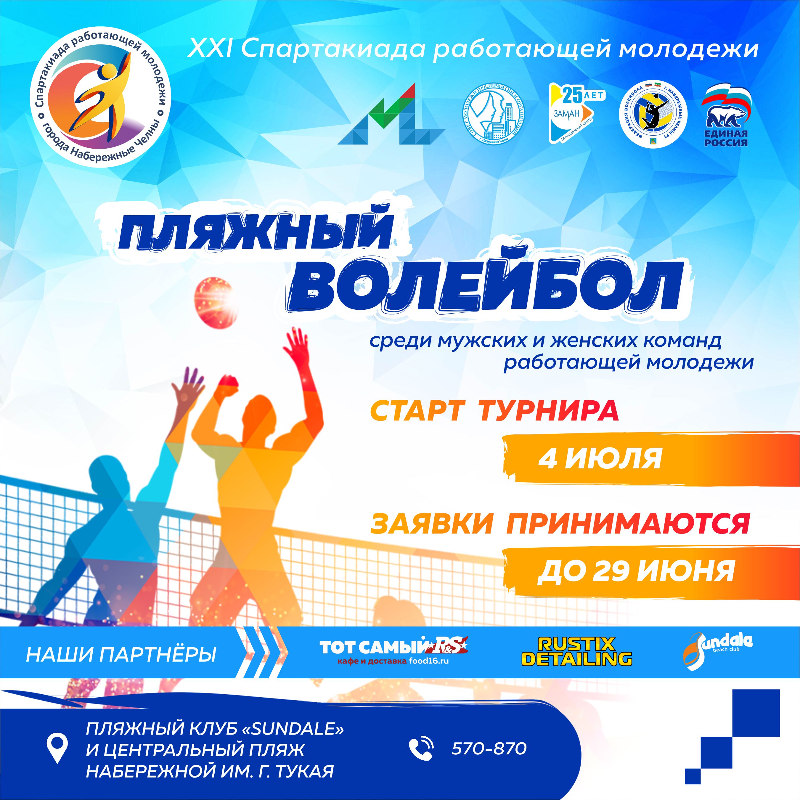 XXI Спартакиада среди работающей молодежи проходит в рамках партийного проекта при поддержке Набережночелнинского местного отделения ВПП «Единая Россия». Организаторы: Совет молодежи предприятий и организаций г. Набережные Челны, Федерация волейбола города Набережные Челны РТ, молодежный центр «Заман» при поддержке управления по делам молодежи Исполнительного комитета города.