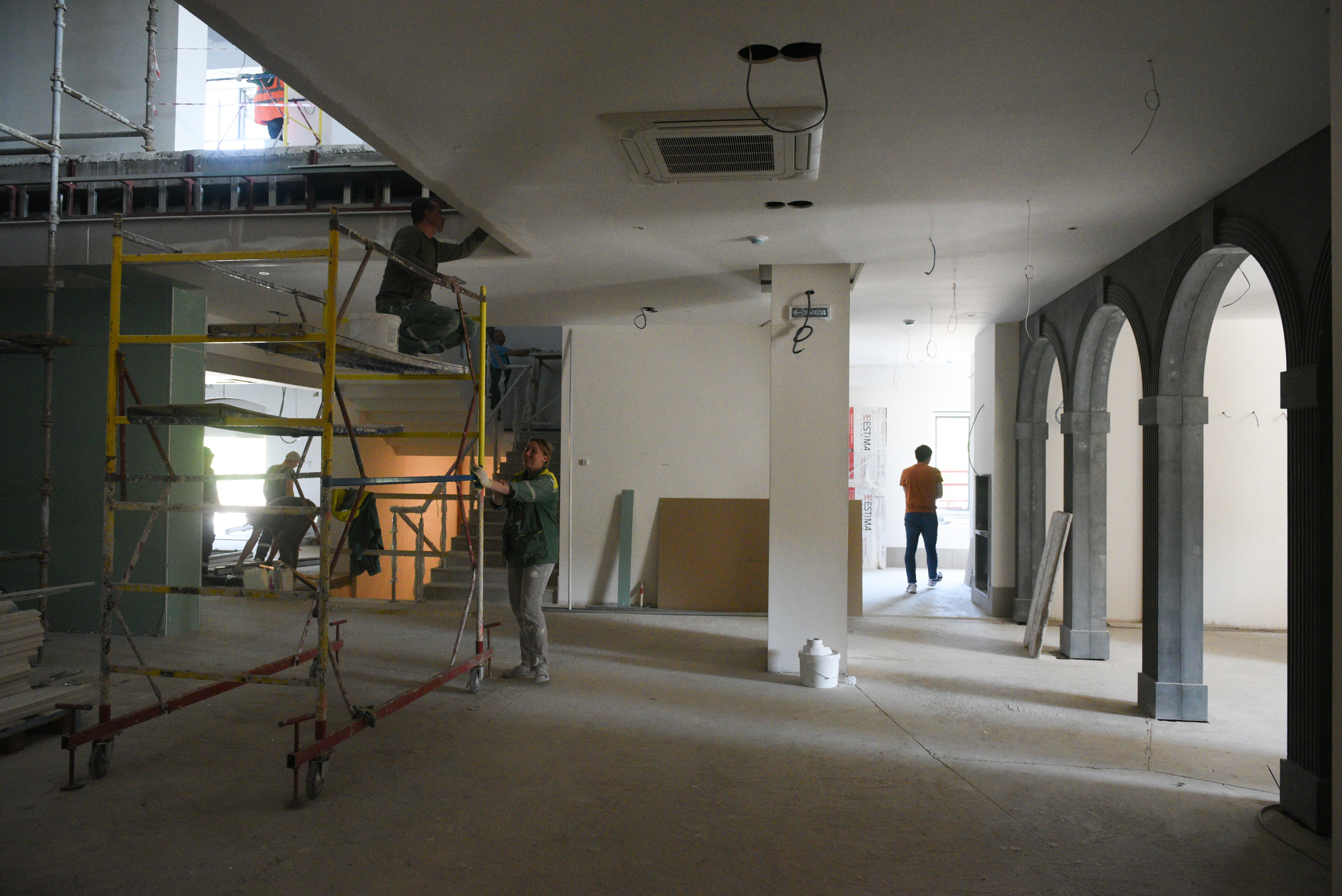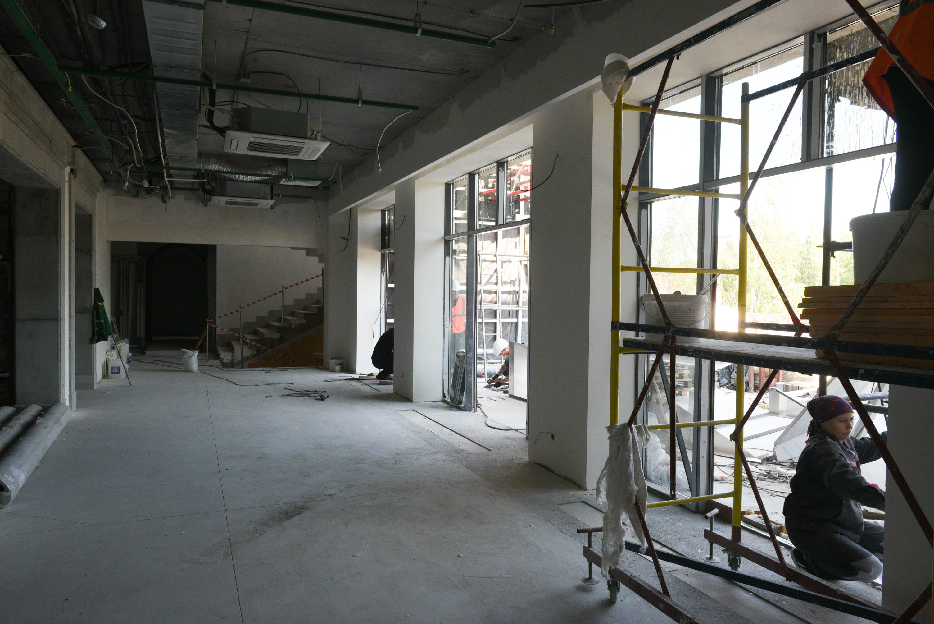 В настоящее время на строительной площадке выполняется устройство фасада, монтаж витражей, устройство внутренних инженерных сетей (электроснабжение, водоснабжение, водоотведение, отопление, вентиляция, слаботочные сети), отделочные работы (штукатурка стен) благоустройство.