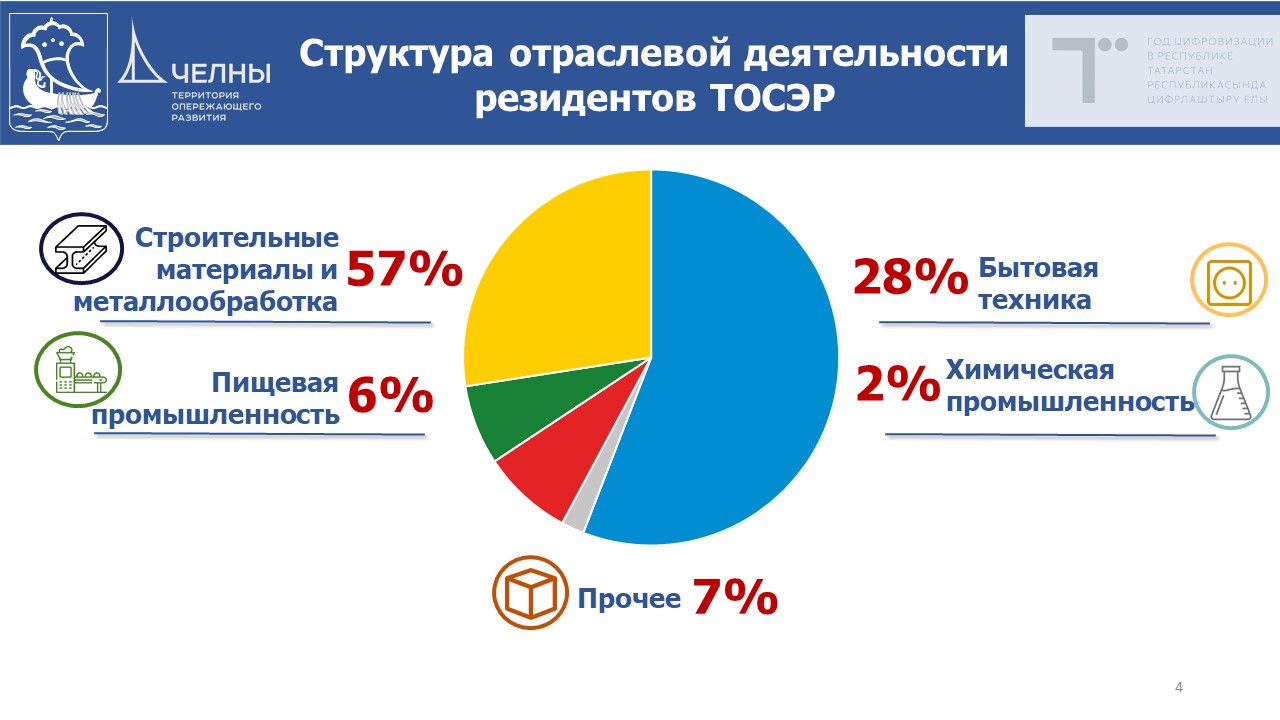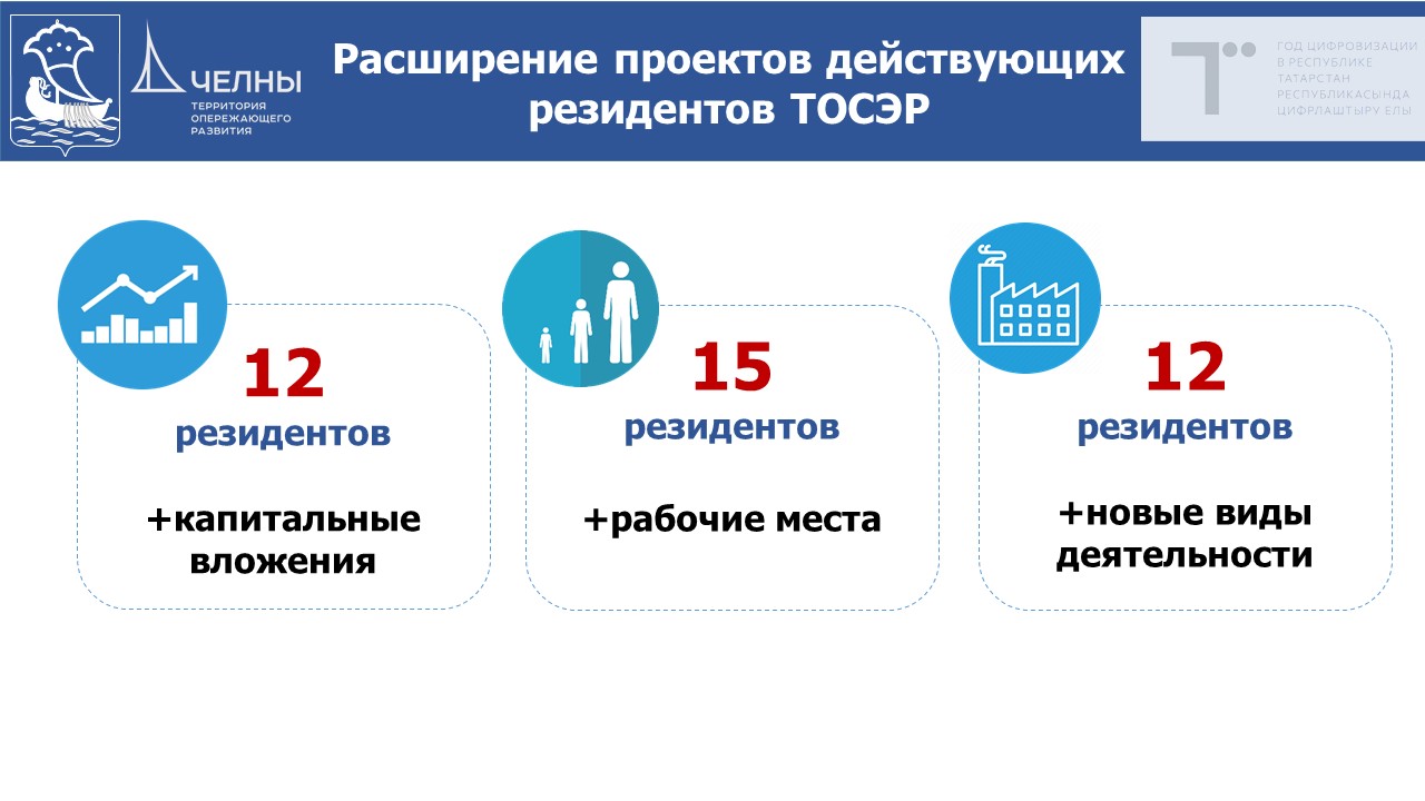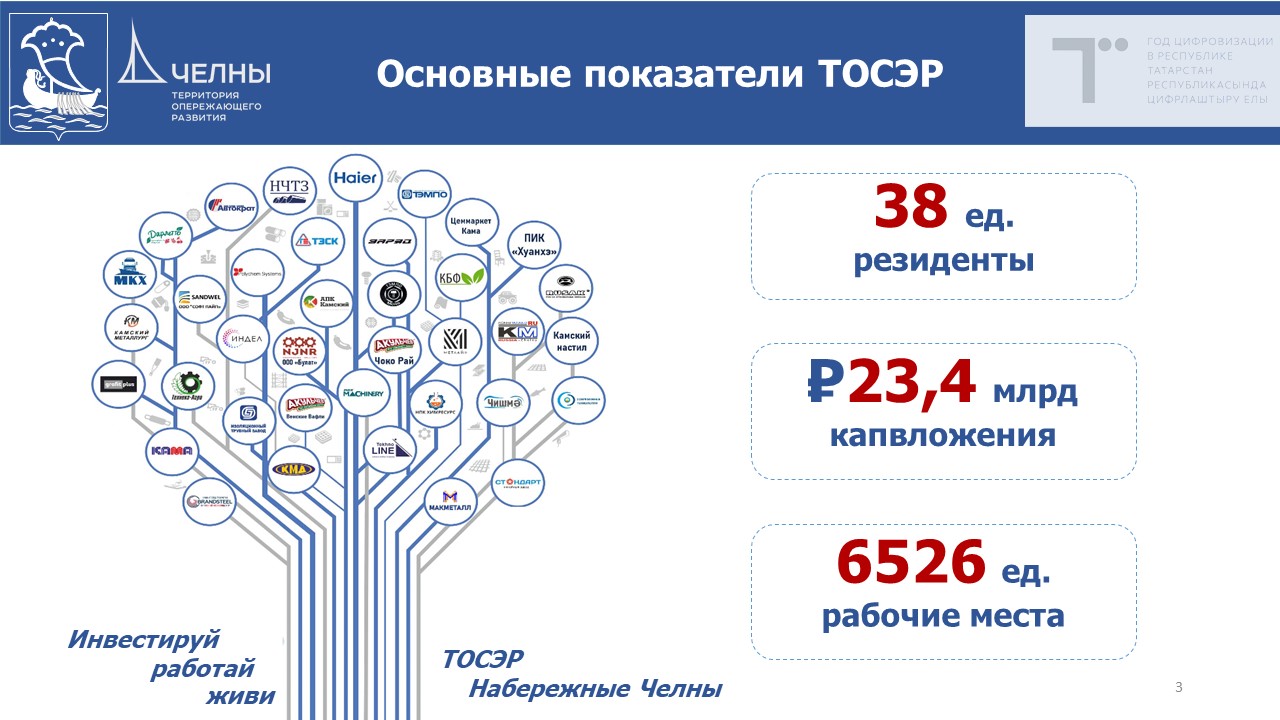 Заместитель руководителя Исполнительного комитета Наталия Кропотова сообщила, что на сегодняшний день статус резидента ТОСЭР в Набережных Челнах присвоен 38 производственным компаниям, которые инвестировали в экономику города около 23 млрд рублей и создали 6526 новых рабочих мест.