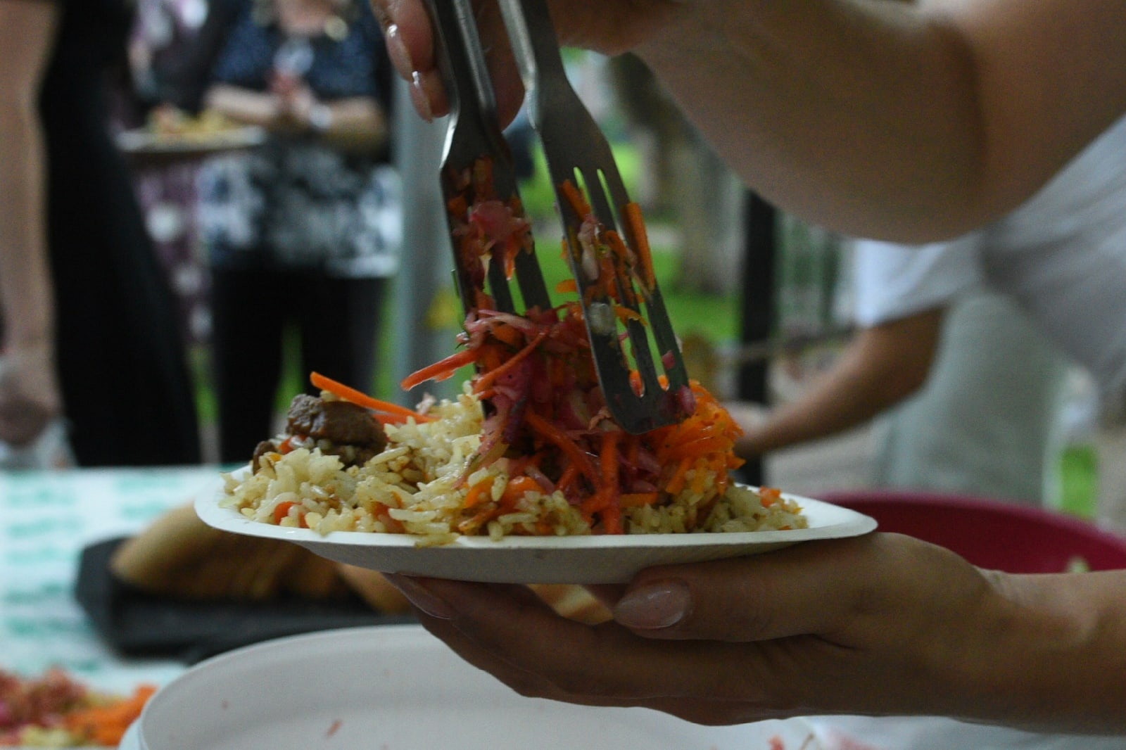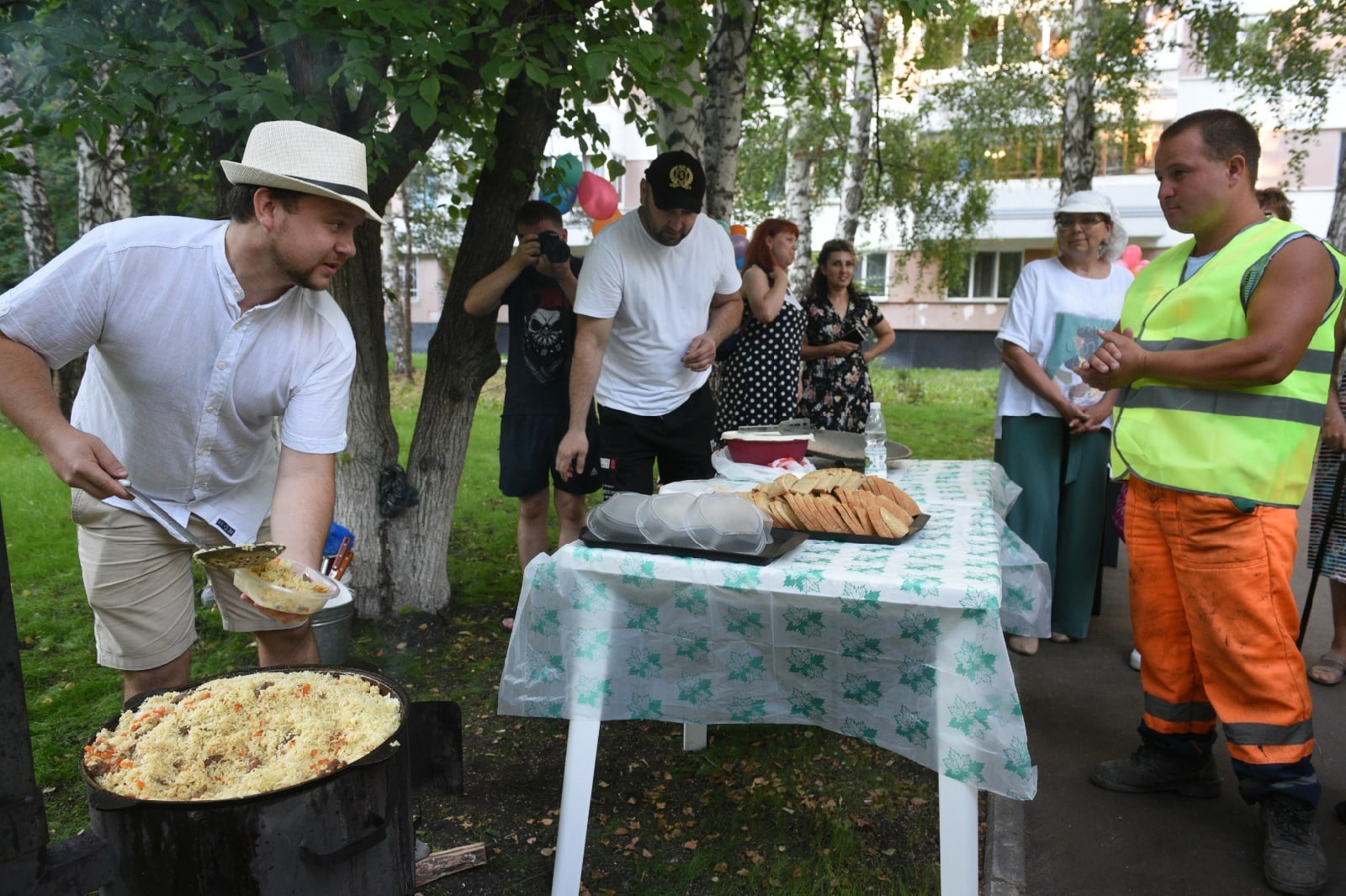 На празднике двора угощали пловом. Так жители 11 комплекса решили поблагодарить работников за хорошую и оперативную работу. На участке работают сотрудники «Камавтодор» и «ПСК».