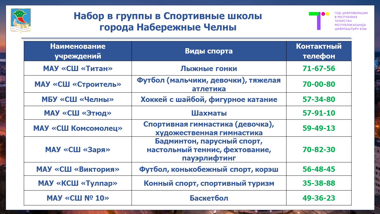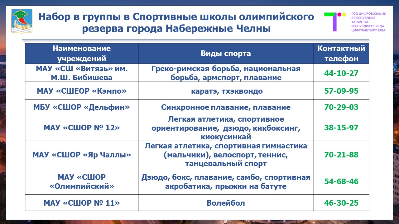 «С начала нового учебного года 16 спортивных учреждений города Набережные Челны объявляют набор в группы детей дошкольного и школьного возрастов для занятий более 30 видами спорта», - сообщил начальник управления спорта в ходе пресс-конференции Роман Насрединов. С 15 августа по 15 сентября будут проходить дни открытых дверей, где можно ознакомиться с деятельностью учреждений самостоятельно. Информацию об учреждениях можно также получить здесь.