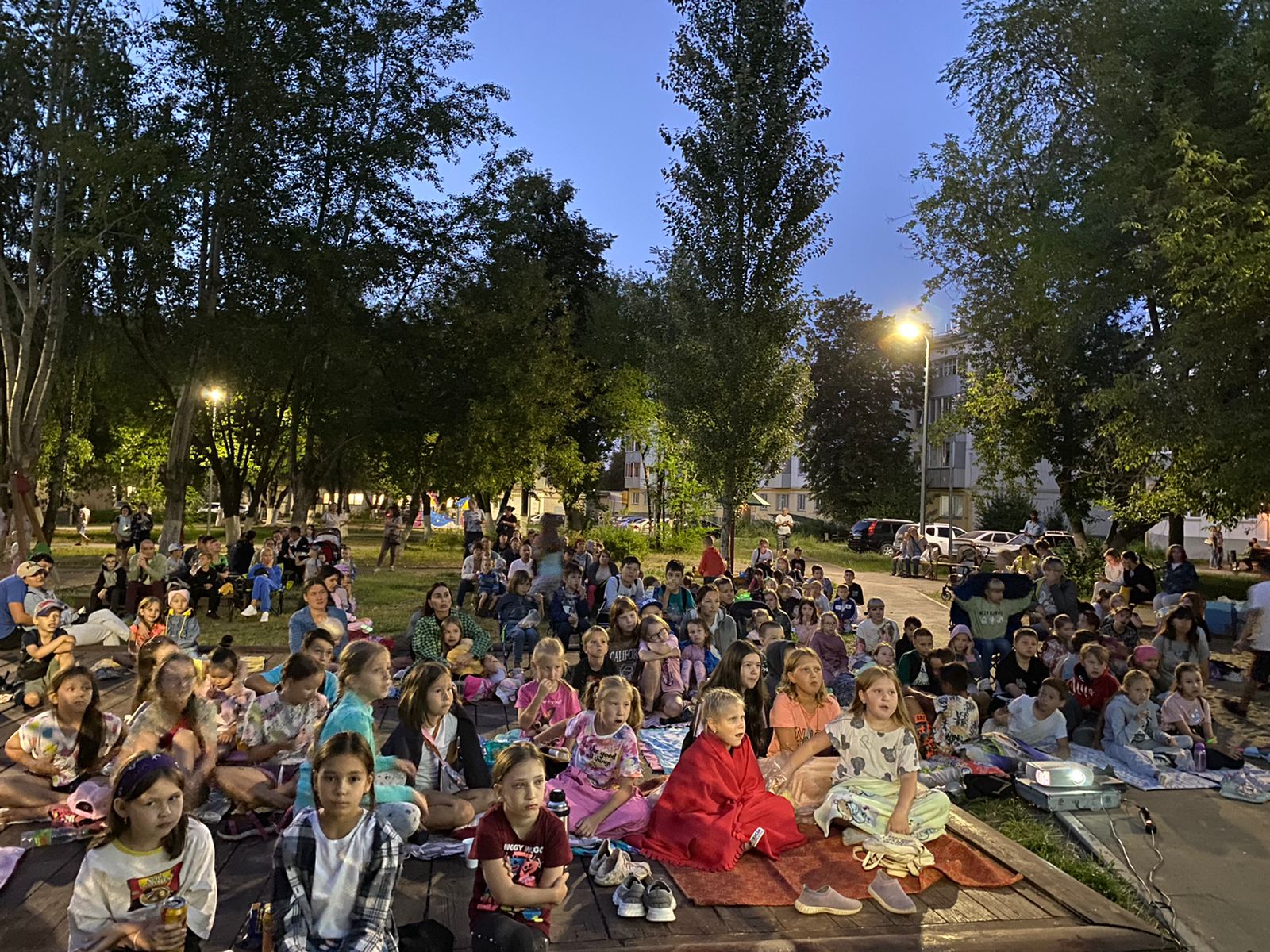 Во всех районах города организованы просмотры фильмов на свежем воздухе. Накануне в 1 комплексе пос.ГЭС на показ фильма собралось более 300 человек. Жители комплекса вышли во двор, взяв с собой пледы.