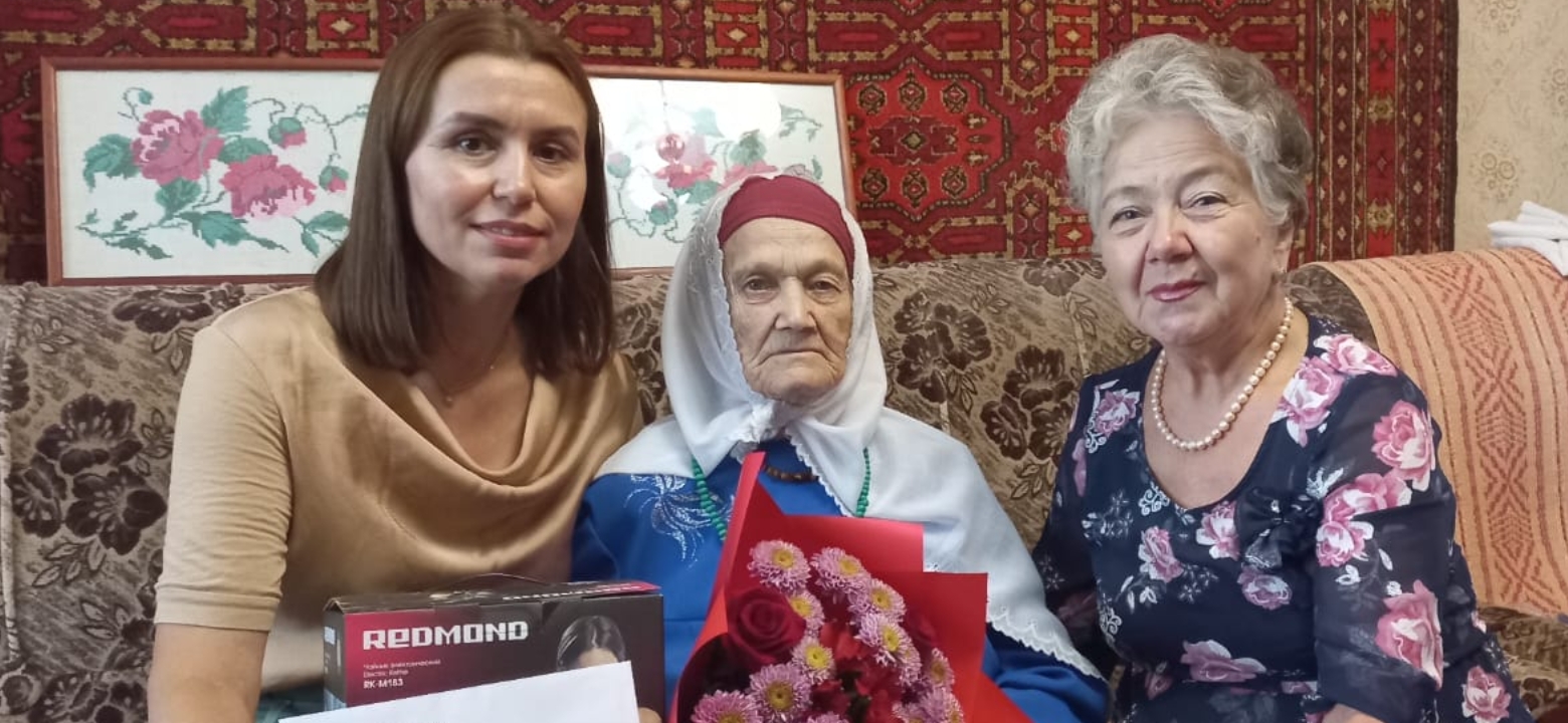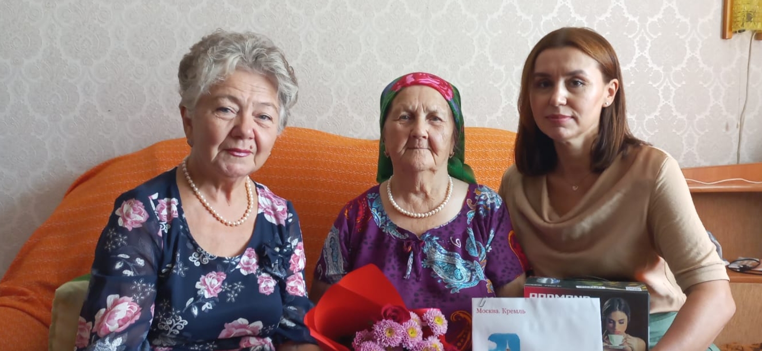 Поздравления и подарки от имени Президента РФ Владимира Путина, мэра  города Наиля Магдеева, депутата Государственного Совета Республики Татарстан Марселя Мингалимова и от себя лично юбиляру вручили заместитель главы администрации Комсомольского района Эльвира Валиева и председатель ТОС Вера Захарова.