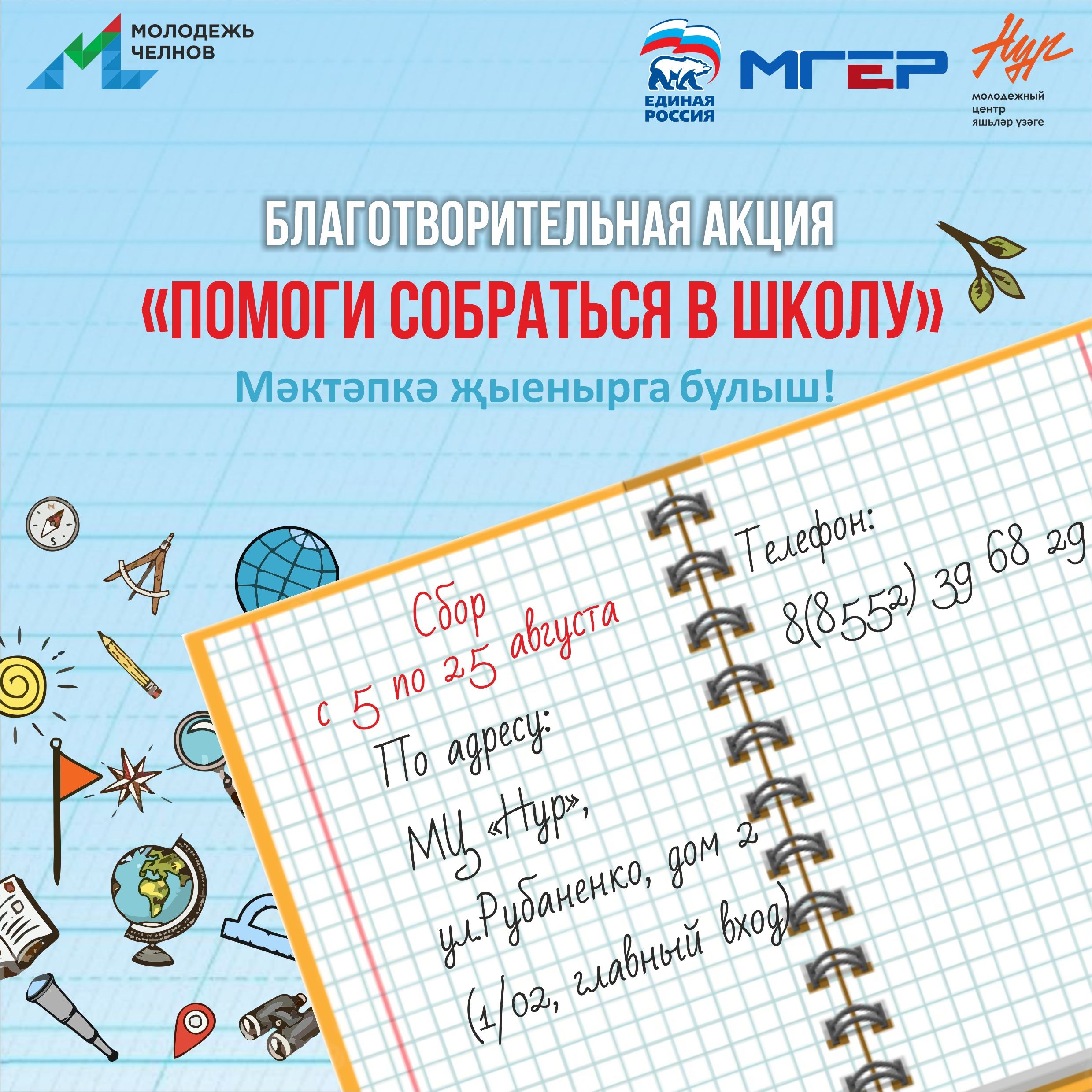 В преддверии нового учебного года Набережночелнинское отделение Молодой гвардии Единой России и молодёжный центр "Нур" проводят благотворительную акцию «Помоги собраться в школу».