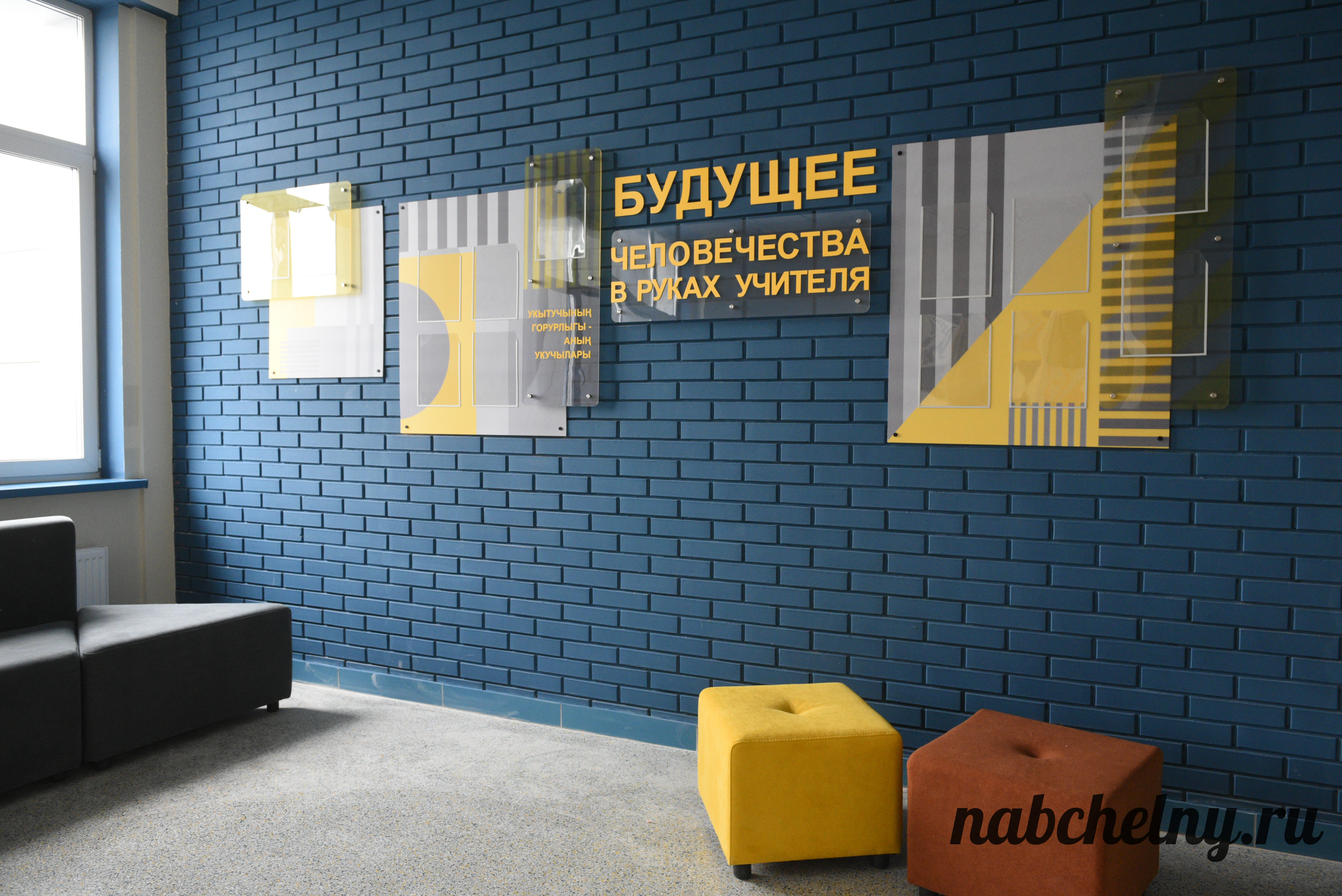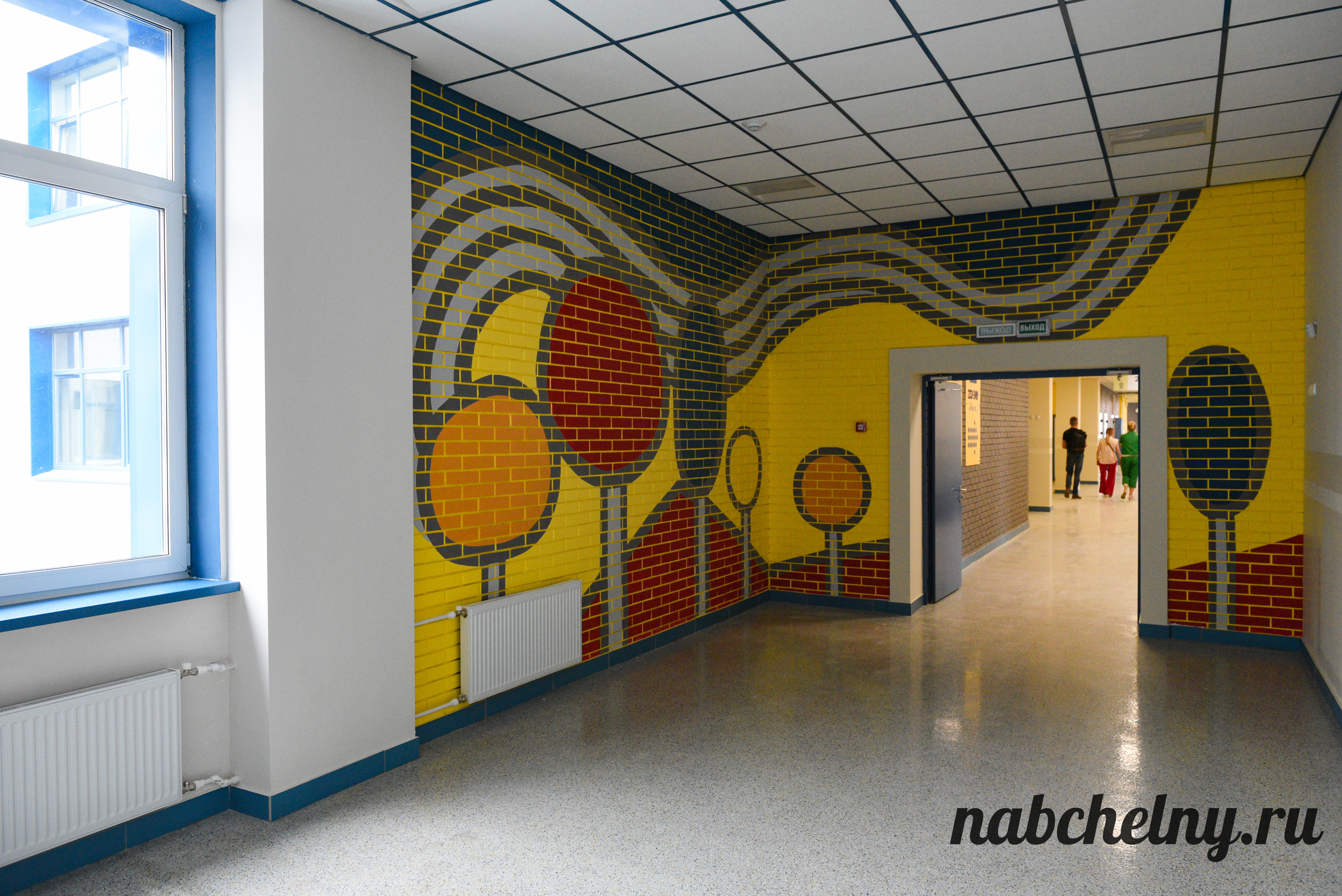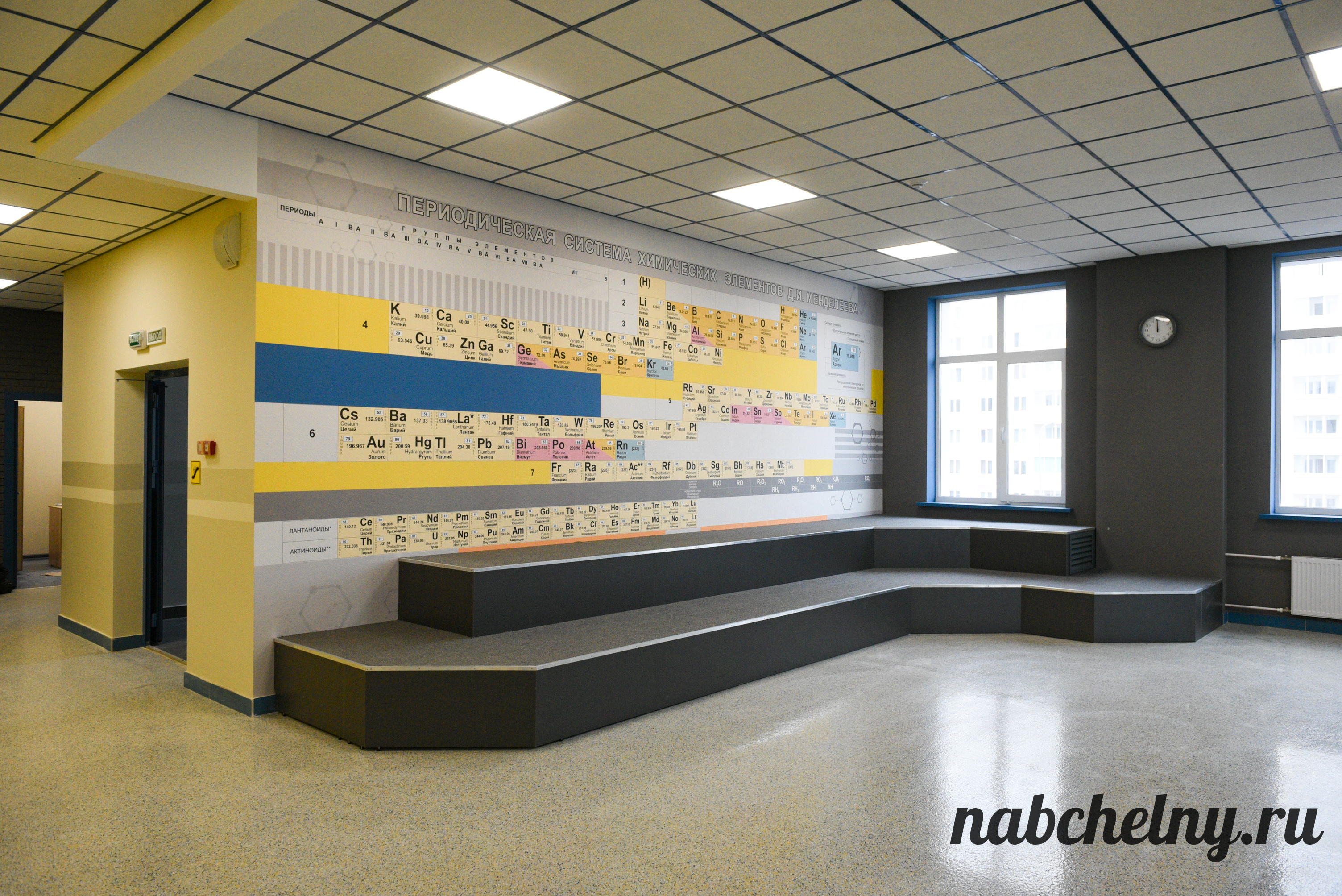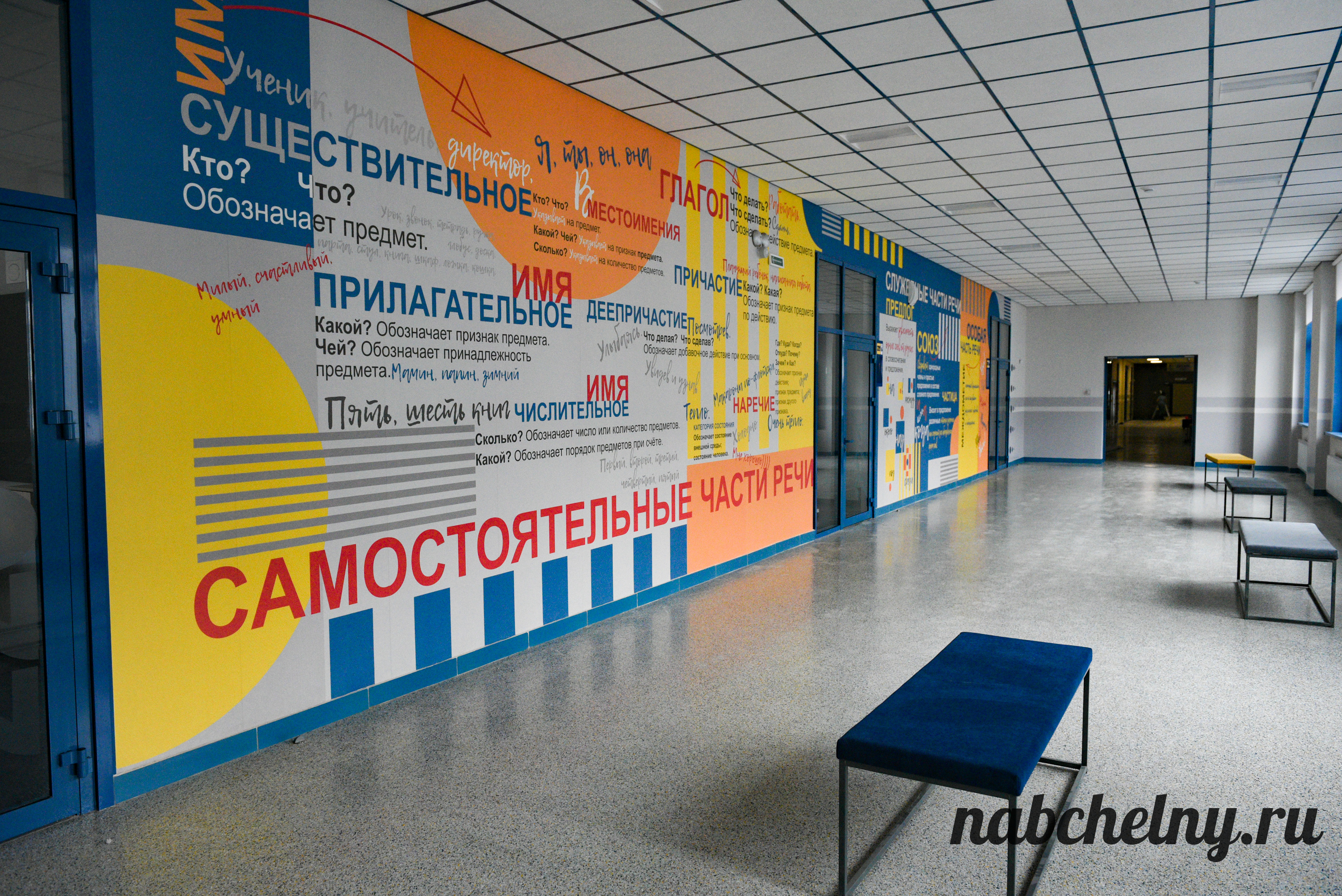 Стены заслуживают особого внимания. На всех этажах созданы зоны с ненавязчивым обучением школьников. К примеру, возле кабинетов русского языка на стены нанесены фотообои, которые посвящены правилами русского языка. Есть блоки об истории Республики Татарстан и города Набережные Челны, мотивационные надписи. Возле кабинета химии размещена таблица Менделеева.
