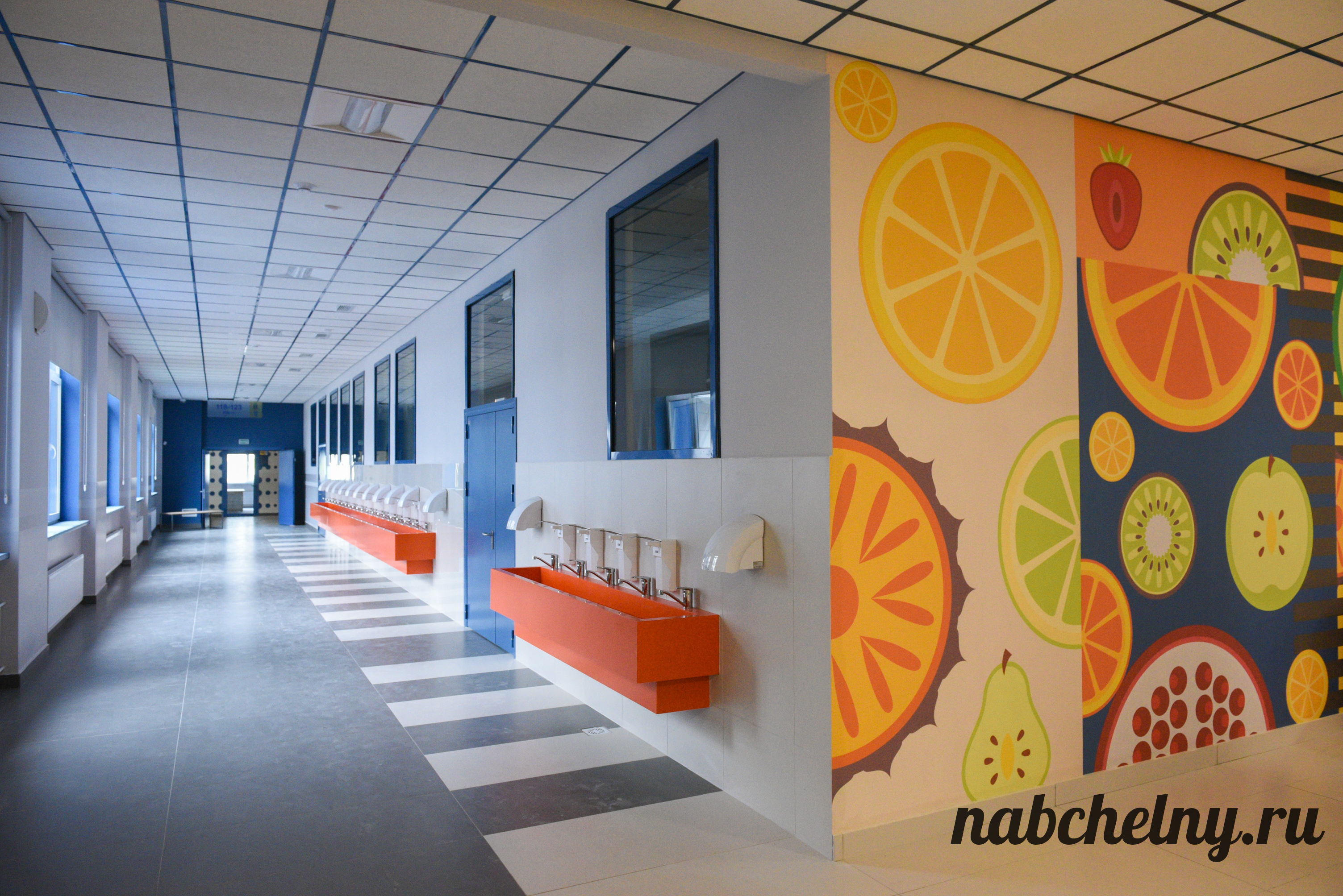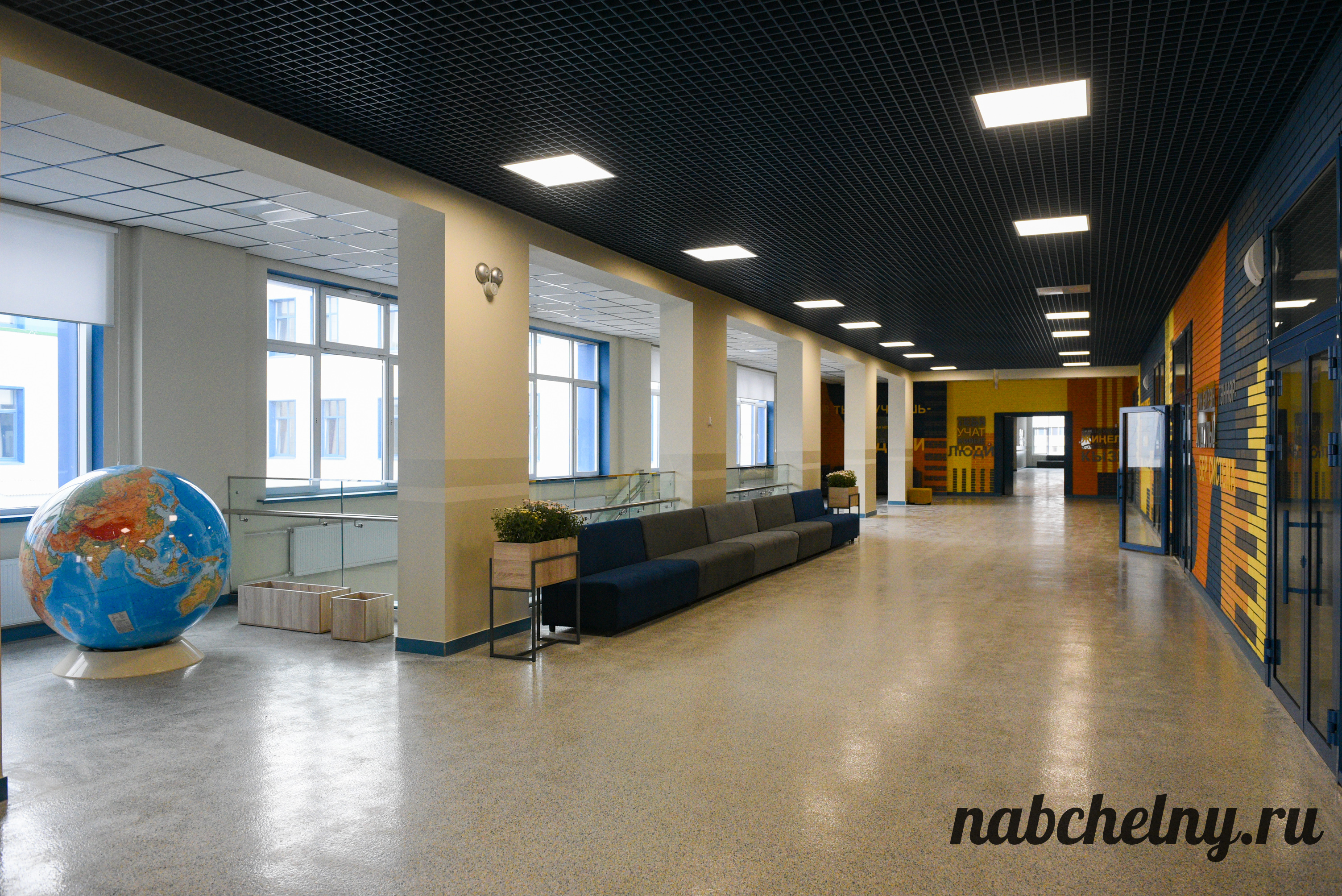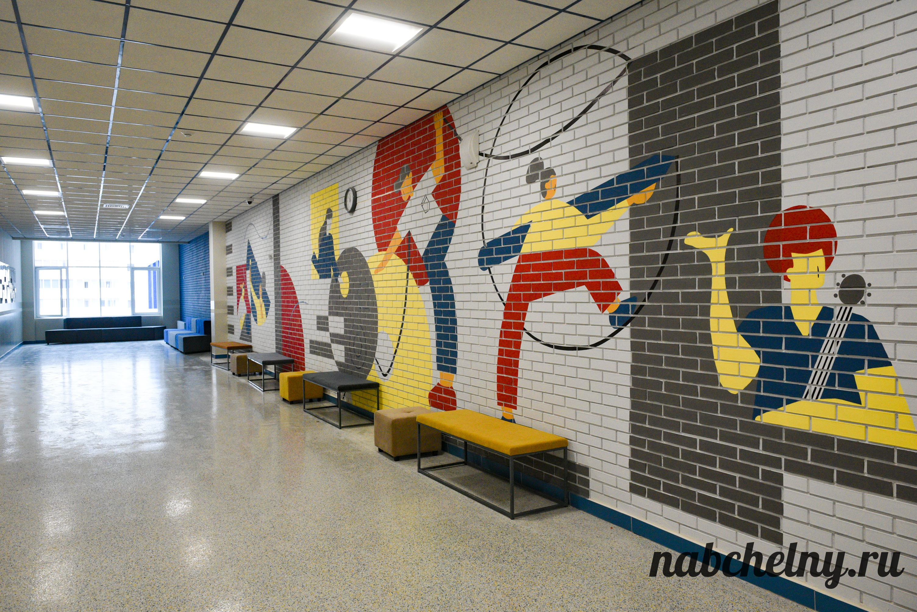 Стены заслуживают особого внимания. На всех этажах созданы зоны с ненавязчивым обучением школьников. К примеру, возле кабинетов русского языка на стены нанесены фотообои, которые посвящены правилами русского языка. Есть блоки об истории Республики Татарстан и города Набережные Челны, мотивационные надписи. Возле кабинета химии размещена таблица Менделеева.