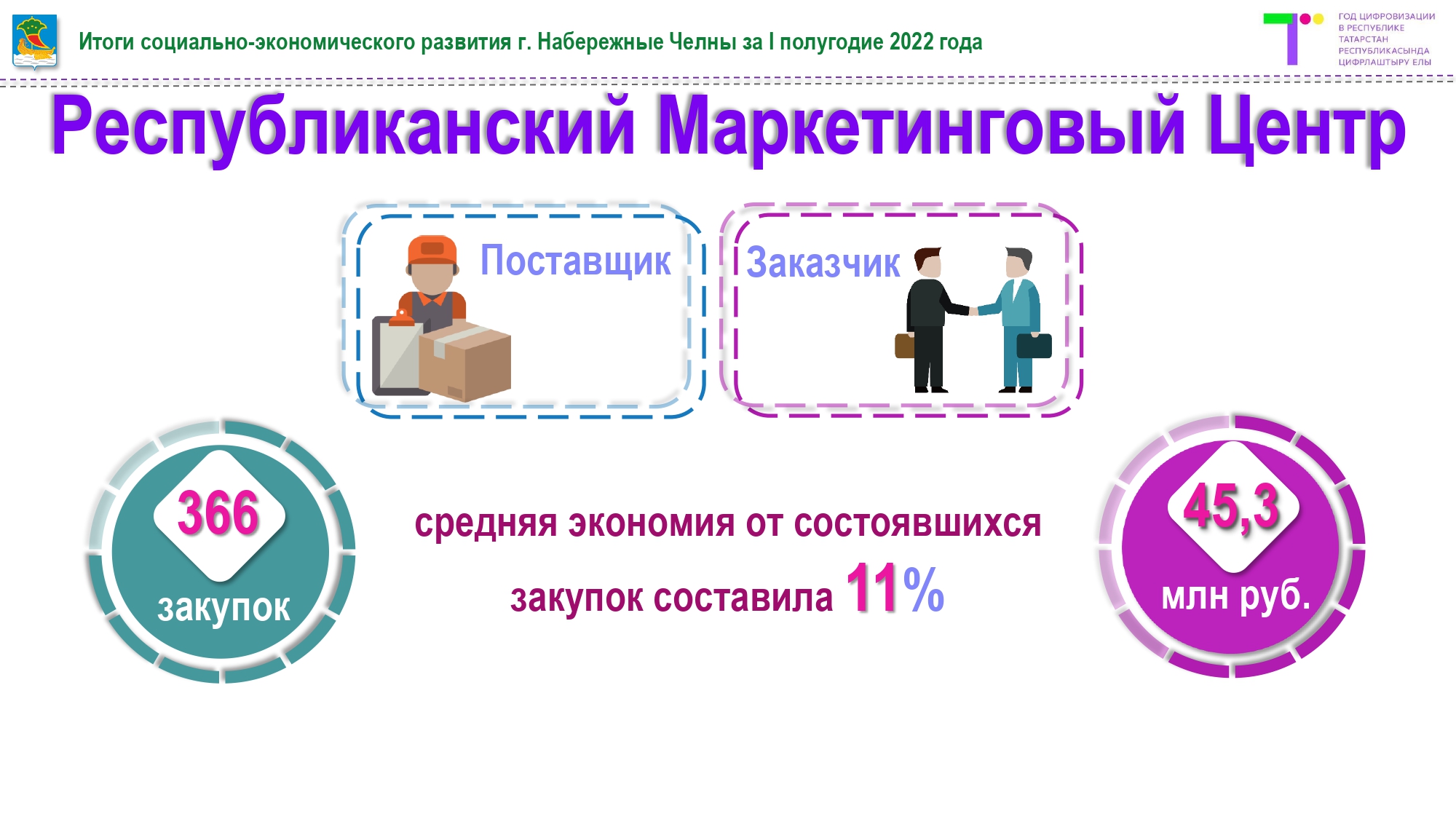 На 1 сентября 382 организации - поставщики получили выручку в сумме 3,2 млрд руб. В закупочном модуле РМЦ проведено 366 закупок на 45,3 млн руб. Необходимо отметить, что средняя экономия от состоявшихся закупок составила 11 %. Особенно важно, что экономию получают малые предприятия.