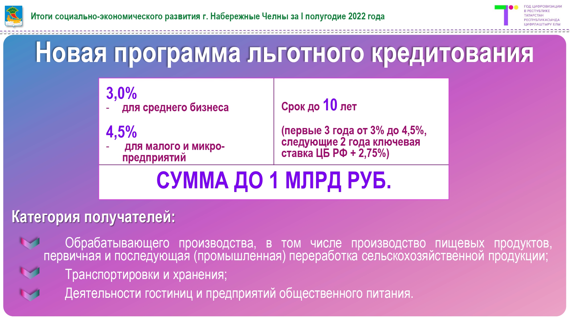 С 1 сентября стартует новая программа льготного кредитования для субъектов МСП. Ставки по кредитам составят 3% для средних и 4,5 % для малых предприятий. Полученные средства можно будет потратить на закупку оборудования, капитальный ремонт производственных помещений или запуск новых производств. Максимальный срок кредита 10 лет. Приглашаем наши компании воспользоваться этой мерой поддержки.
