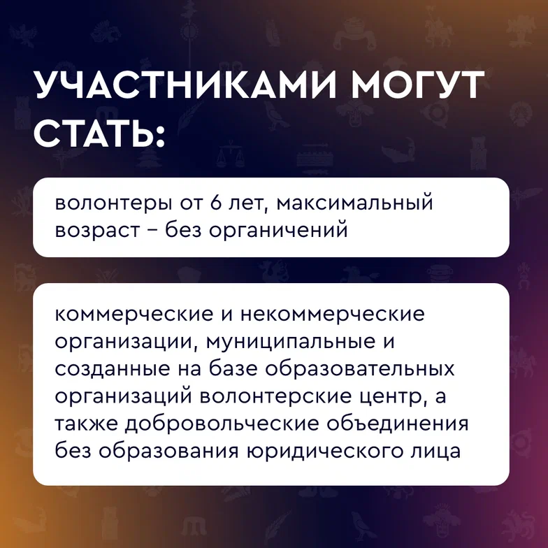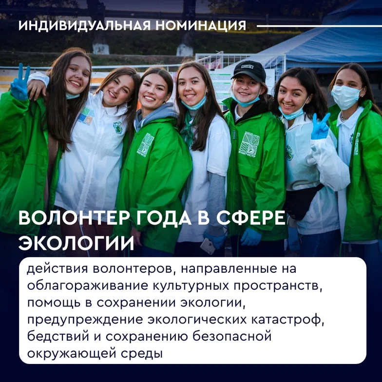Принять участие в премии может абсолютно любой волонтер от 6 лет, добровольческая организация или представитель бизнеса по 18 номинациям: 5 коллективных номинаций («Бизнес», «Организатор добровольчества», «Школьный добровольческий отряд» и другие) и 13 индивидуальных номинаций («Серебряный доброволец года», «Доброволец года в сфере туризма», «Доброволец года в рамках Общероссийской акции взаимопомощи «#МыВместе» и другие). В этом году сбор заявок будет проходить на автоматизированной площадке «Добро. Конкурсы» платформы ДОБРО.РФ.