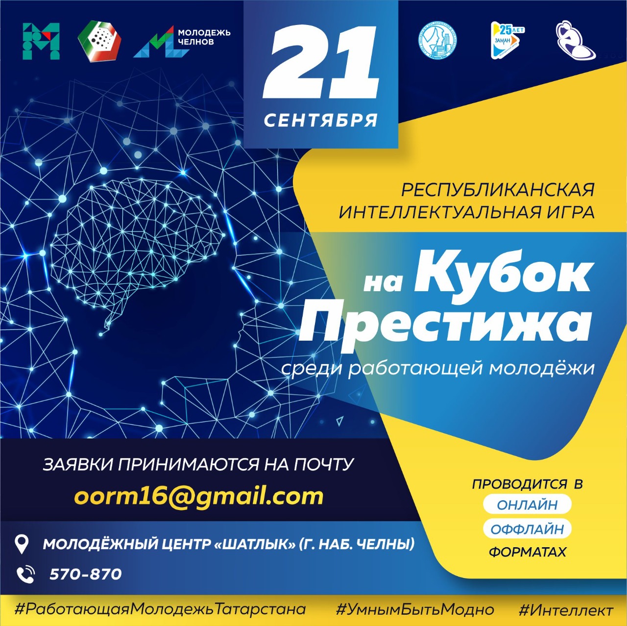 Интеллектуальную игру на Кубок Престижа среди работающей молодежи РТ организуют: Министерство по делам молодежи РТ, РОО «Союз молодёжи предприятий и организаций РТ», МОО «Совет молодежи предприятий и организаций г. Набережные Челны», АНО «Интеллект», МАУ «Молодежный центр «Заман» при поддержке управления по делам молодёжи города Набережные Челны.