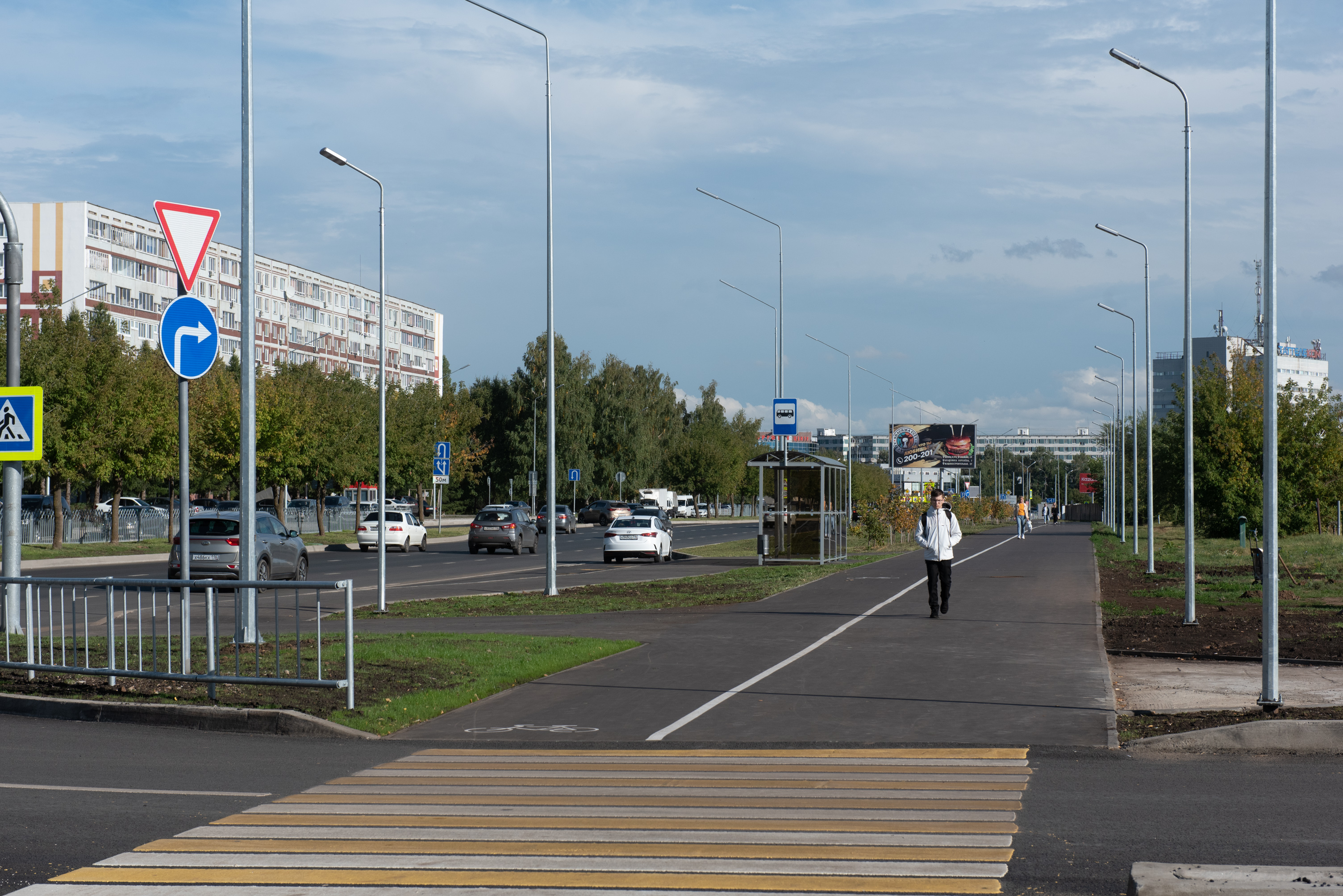 Участок дороги стал комфортнее и для пешеходов. Обустроены пешеходные тротуары и велодорожки вдоль проспекта со стороны 31 комплекса, проходящие от пр. Чулман до студенческих общежитий. Ранее их не было.