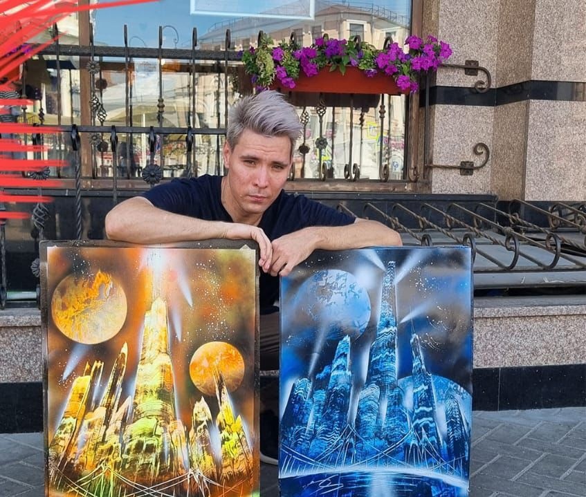 Используя различные трафареты Дмитрий Борзенков создаёт очертания планет, деревья, горы, здания, города, оставляя живописные отпечатки на холстах.