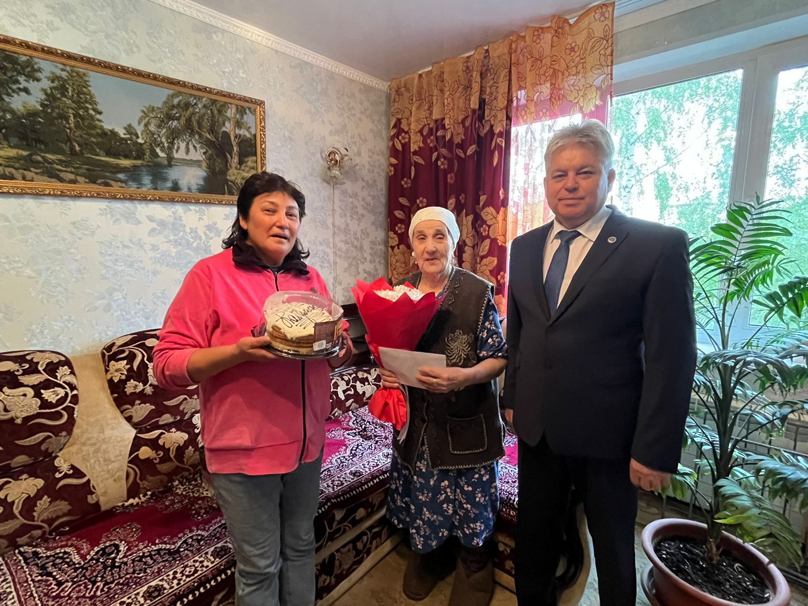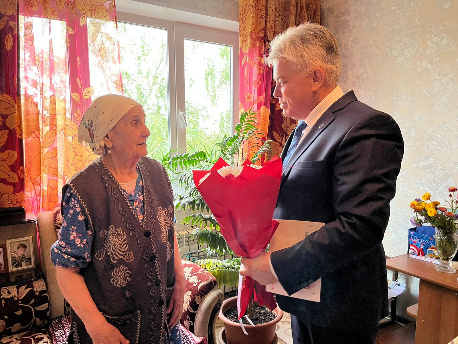 Поздравления и подарки от имени президента Российской Федерации Владимира Путина и мэра города Наиля Магдеева юбиляру вручил глава администрации Автозаводского района Винер Харисов. К поздравлению ветерана присоединилась председатель ТОС 49 комплекса Фарида Хафизова.
