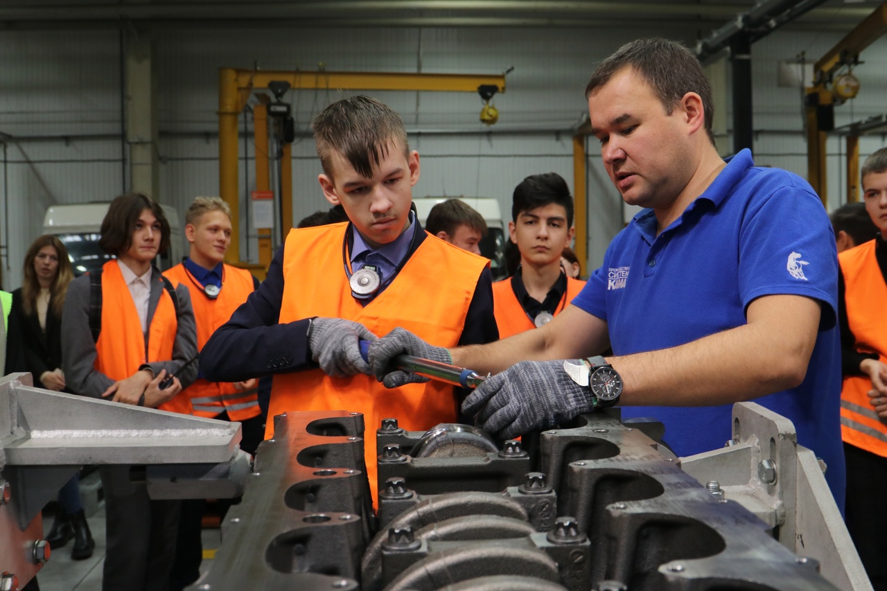 Завод двигателей предложил учащимся ознакомиться с основными производствами новейших двигателей КАМАЗ, ребята изучили конвейерную линию, цех стыковки двигателя и коробки передач. Самым впечатляющим местом на производстве оказался учебно-технологический комплекс, в котором учащиеся выполнили профессиональные пробы по сборке отдельных элементов двигателя. Профессиональные пробы показали, что собирать, закручивать, используя современные инструменты могут не только юноши.