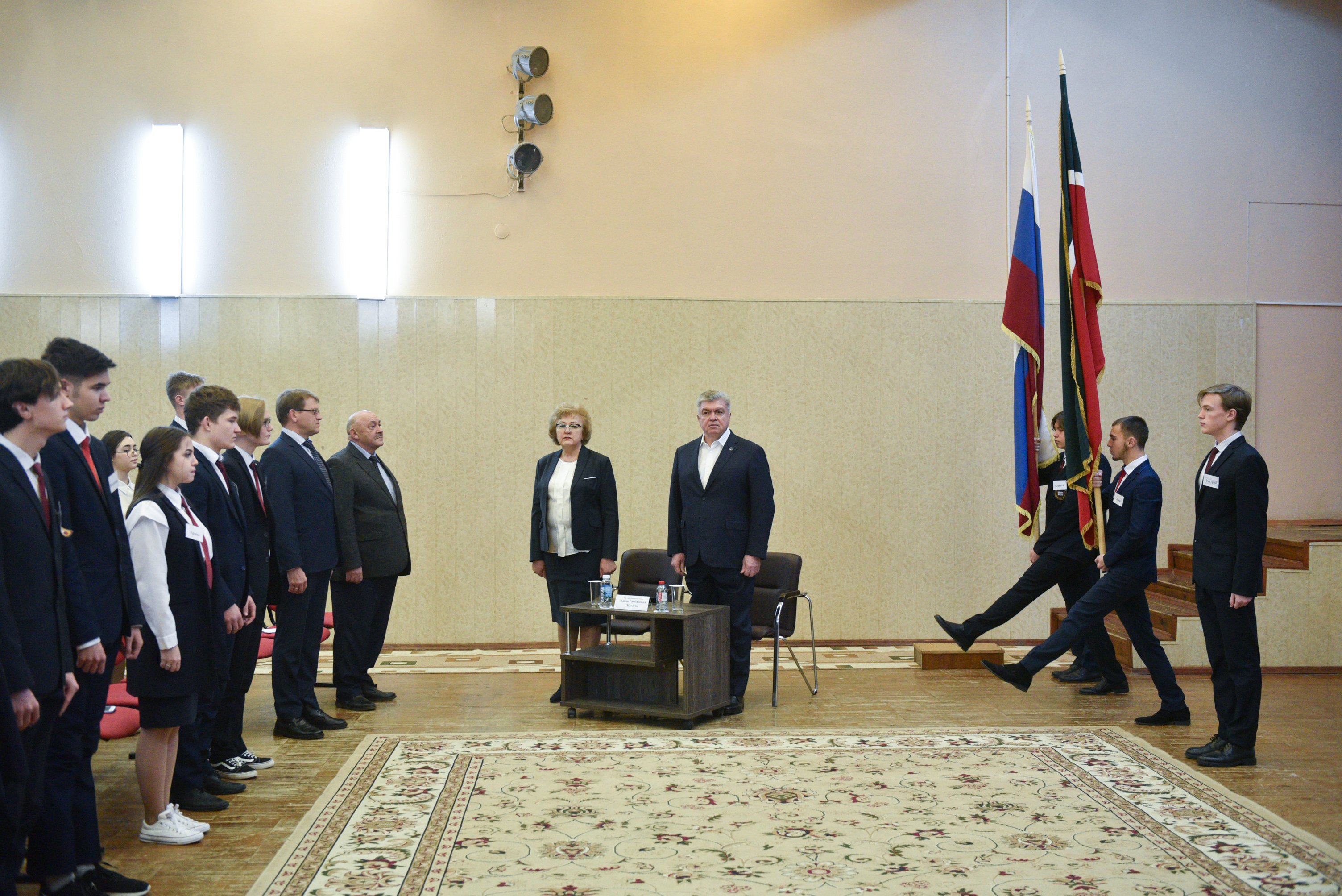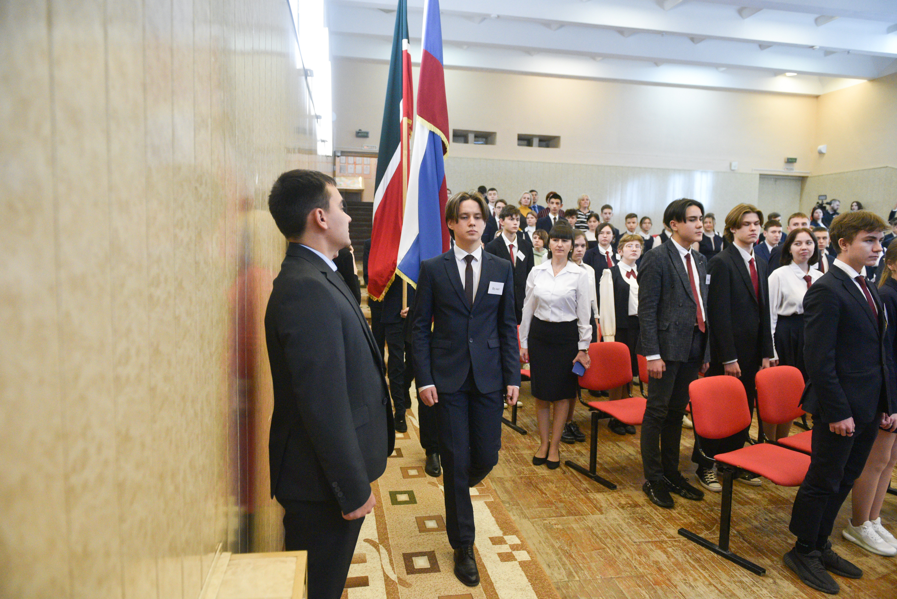Сегодня для старшеклассников школы №56 урок стал особенным – его лично провел мэр города Наиль Магдеев. В актовом зале прошло традиционное поднятие российского флага под гимны Российской Федерации и Республики Татарстан. Эта церемония проходит в челнинских школах каждый понедельник.