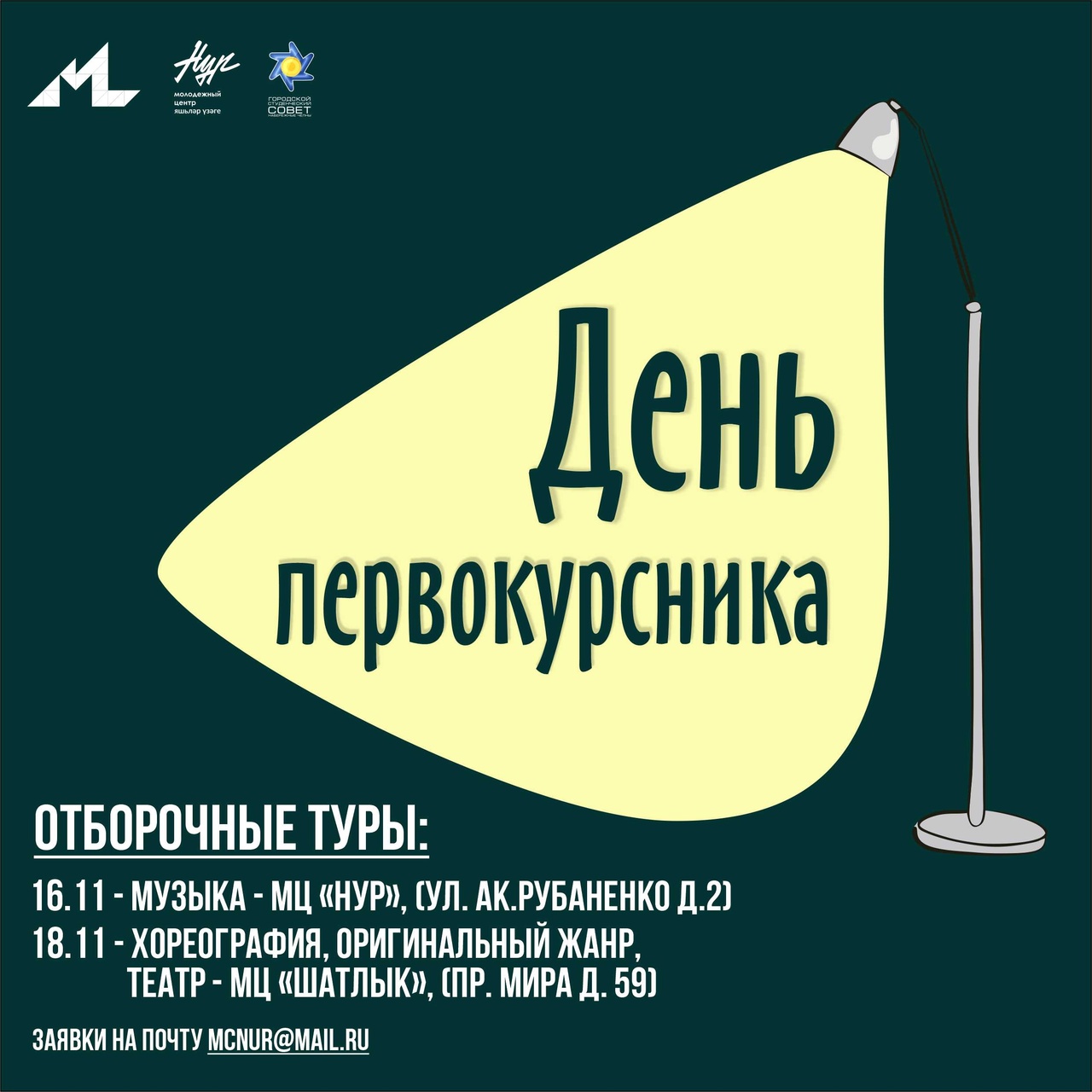 16 и 18 ноября в Молодёжных центрах «Нур» и «Шатлык» будут проведены отборочные туры по 4 направлениям: «Музыка», «Хореография», «Театр», «Оригинальный жанр».