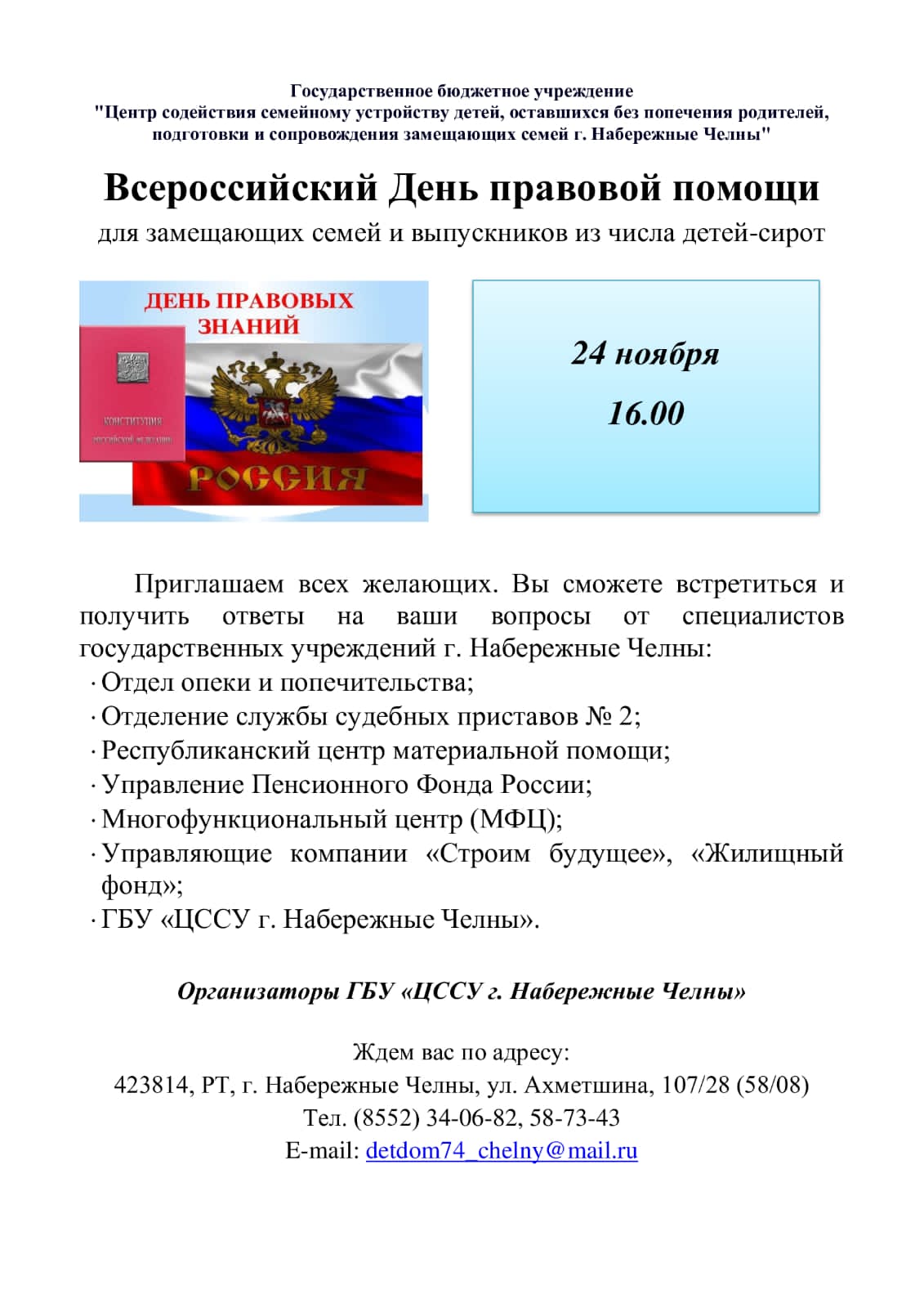 24 ноября в рамках Всероссийского Дня правовой помощи в Набережных Челнах пройдет встреча с работниками госучреждений для замещающих семей и выпускников из числа детей сирот. Встреча пройдёт в 16:00 в Центре содействия семейному устройству детей по адресу 58/08 (ул. Ахметшина, 107/28).