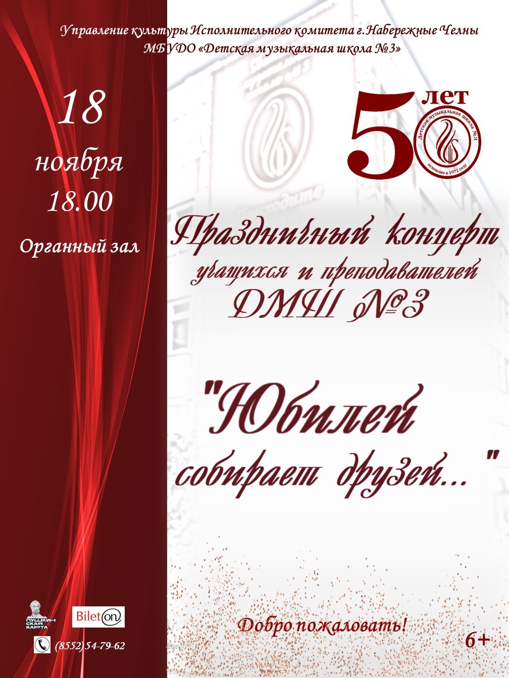 Праздничный концерт учащихся и преподавателей детской музыкальной школы №3 "Юбилей собирает друзей..." посвящён 50-летию со дня основания учреждения. В концерте принимают участие солисты и творческие коллективы школы: оркестр народных инструментов «Карусель», духовой оркестр, хоровые коллективы «Дети Солнца», «Лучики солнца», «Унисон» и «Я пою», педагогический ансамбль народных инструментов «Челнинский сувенир» и вокальный ансамбль преподавателей «Фантазия». Украшением концерта станут выступления выпускников прошлых лет – Григория Грицкова, Елизаветы Дерябиной, Дианы Давлетшиной.