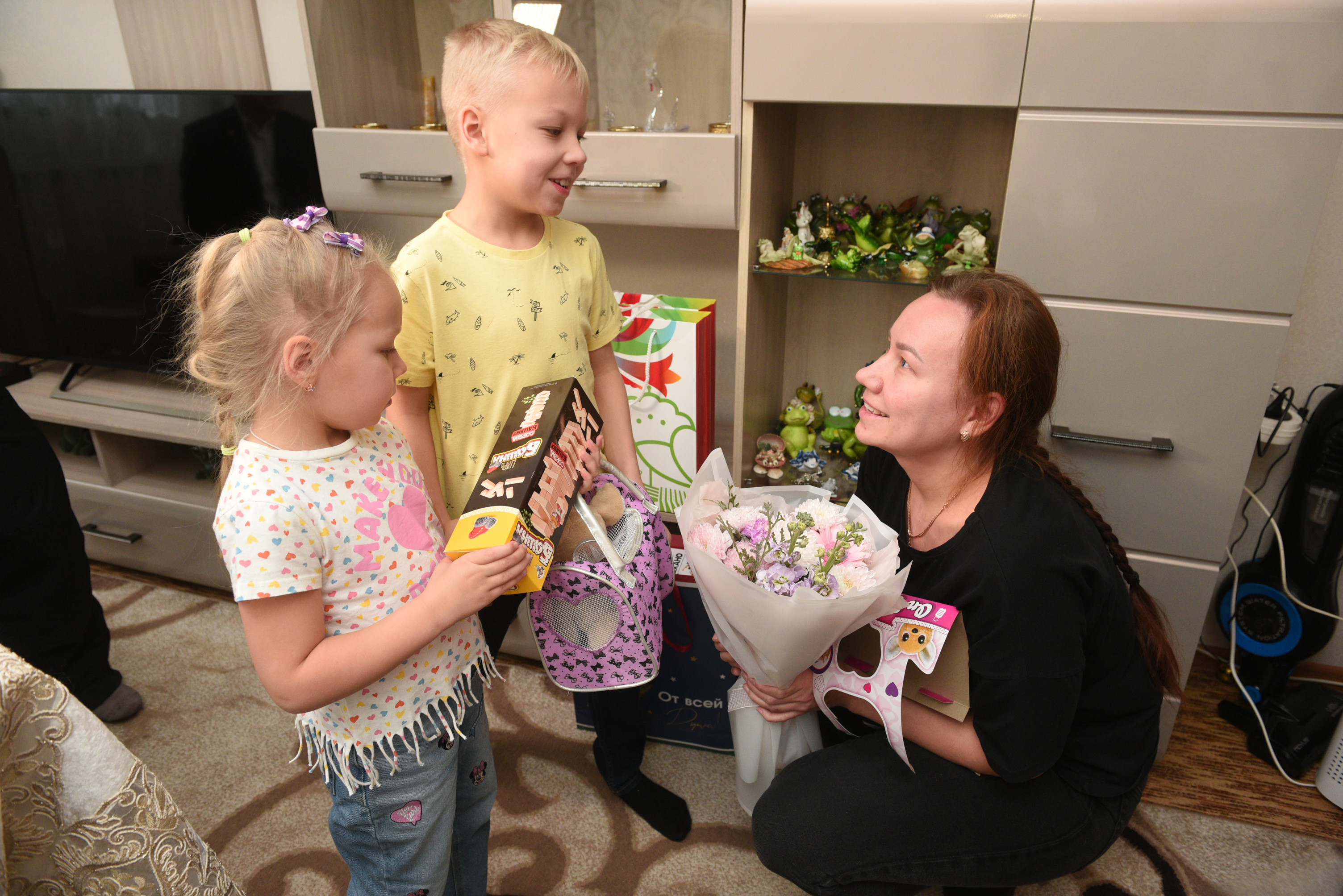 Мэр пообщался с семьей, вручил маме военнослужащего и супруге букеты, а детям – подарки и книги.