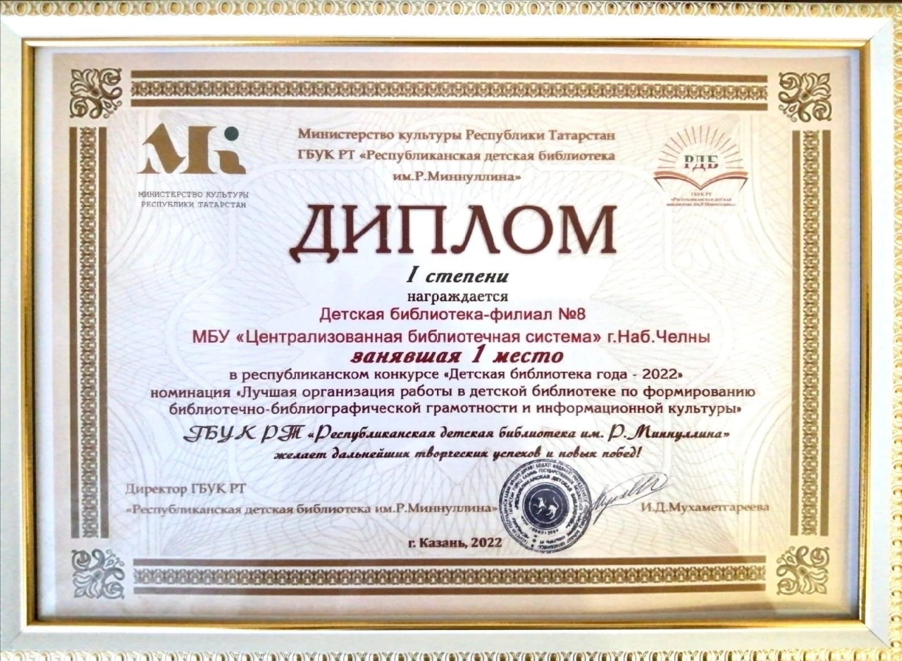 Детская библиотека-филиал №8 Централизованной библиотечной системы стала победителем республиканского конкурса «Детская библиотека года - 2022» в номинации «Лучшая организация работы в детской библиотеке по формированию библиотечно-библиографической грамотности и информационной культуры».