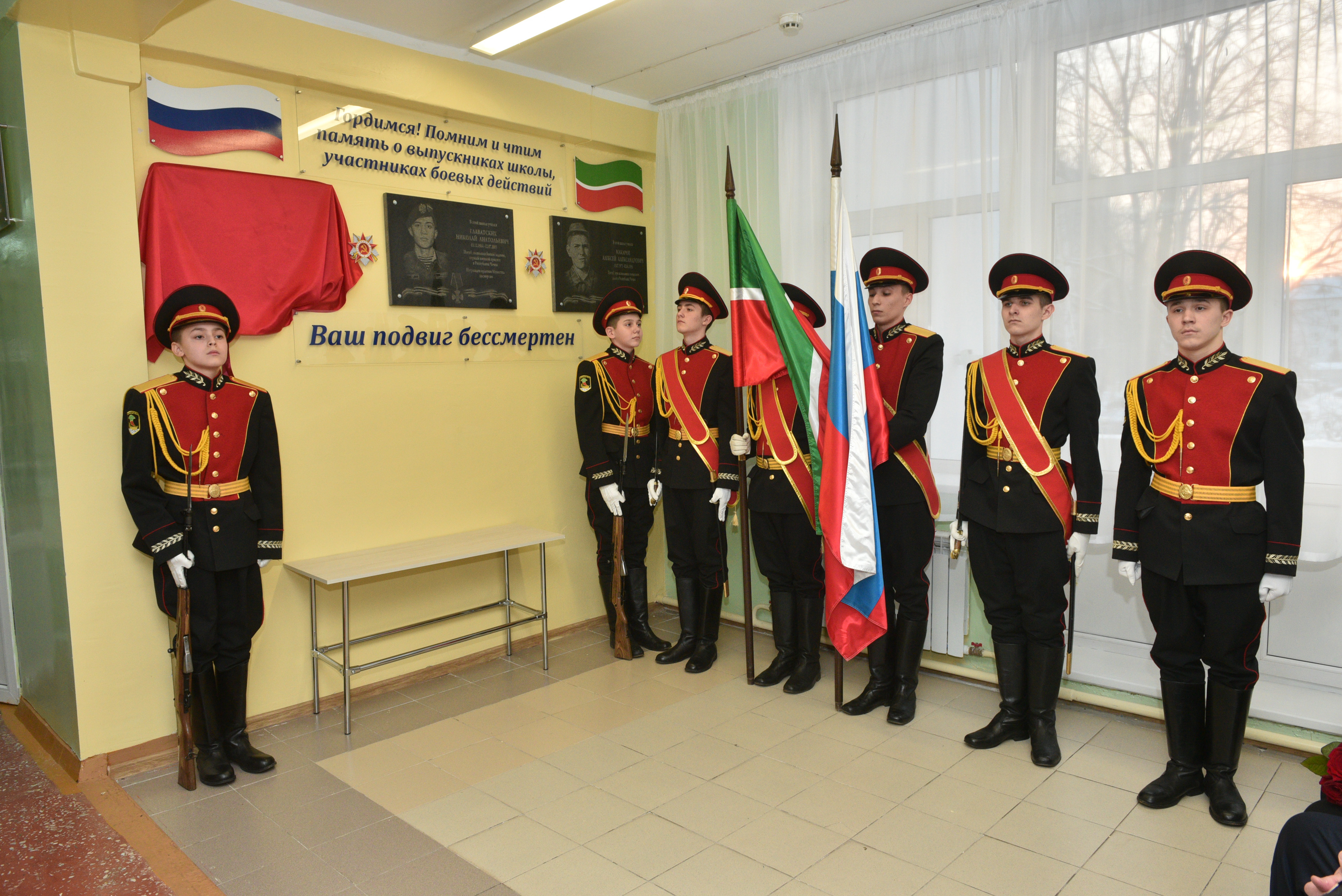 Мэр города Наиль Магдеев обратился к родителям героев со словами поддержки, отметив, что они воспитали достойных сыновей своего Отечества: «Мы скорбим о наших героях, которые в трудное для страны время отдали свои жизни за наше будущее. Мы всегда будем помнить, что в этой школе учились герои, настоящие мужчины. Проходя каждый день по коридорам школы, мальчишки и девчонки будут помнить об их подвиге. Мы и дальше будем делать всё для сохранения исторической памяти о наших героях».