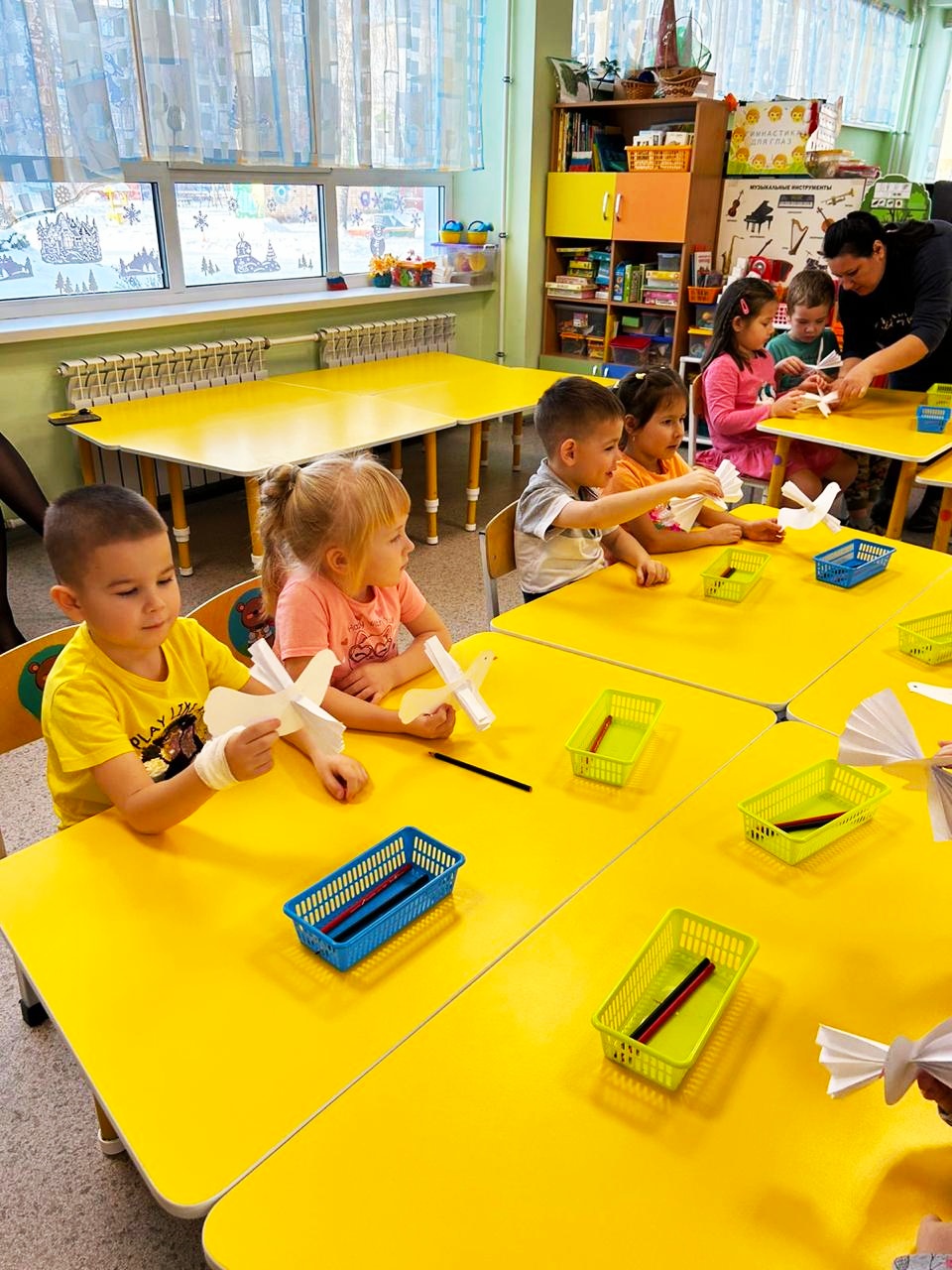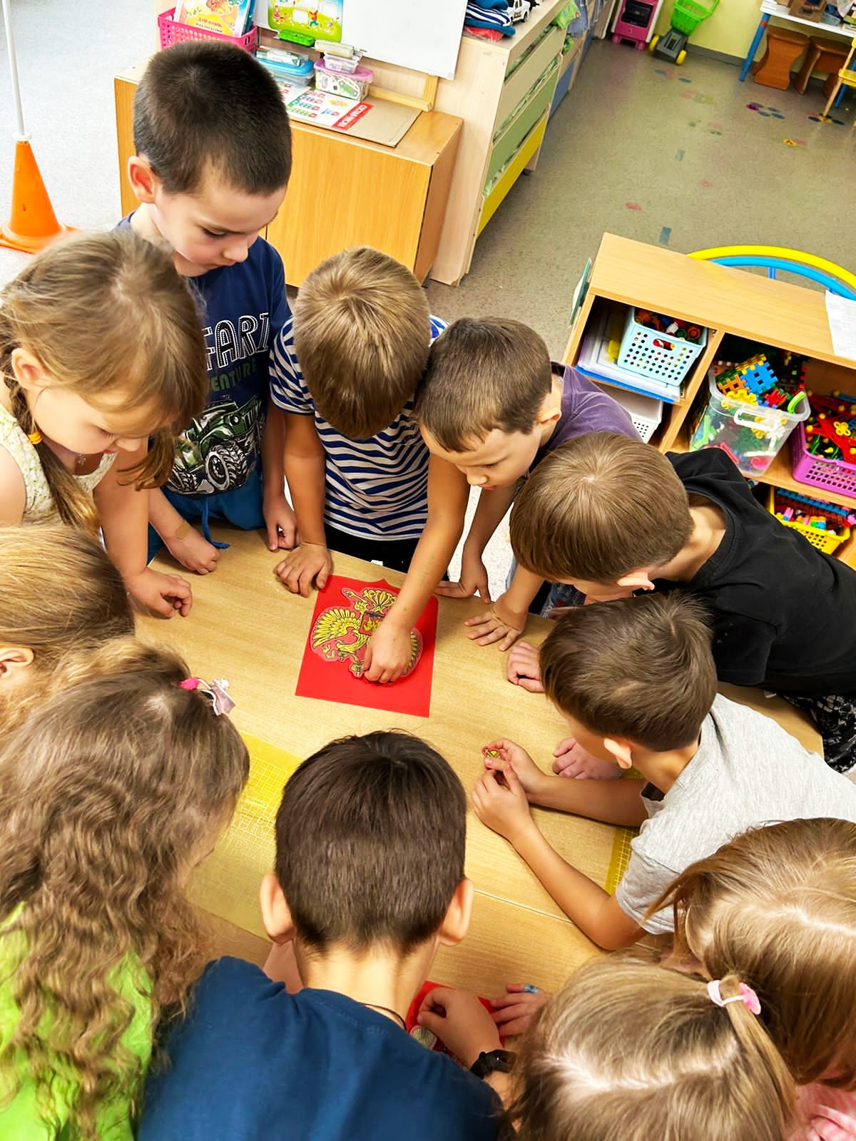 В процессе игры ребята выбирали символы России, собирали из паззлов флаг и герб Российской Федерации, показывали на карте территорию РФ и крупные города, конструировали из бумаги белых голубей.