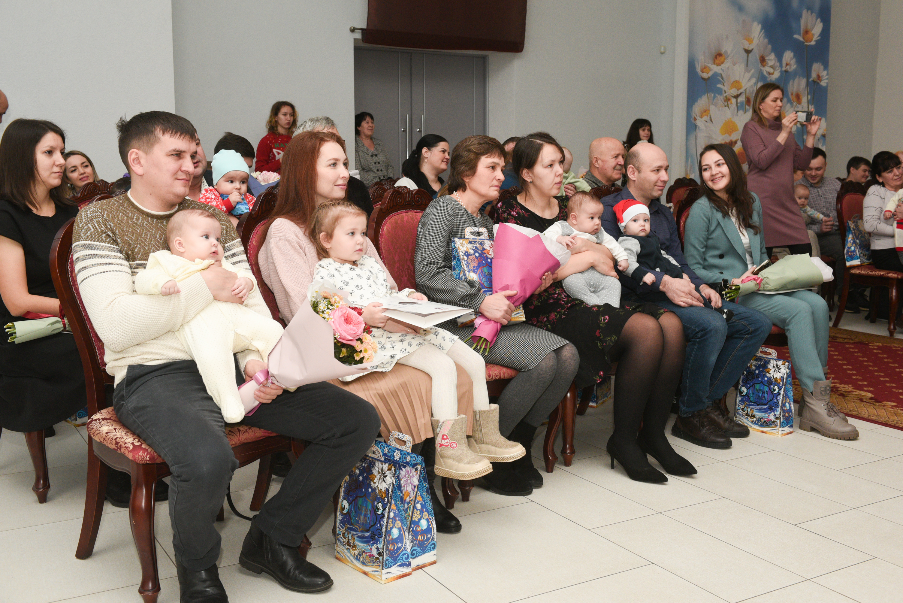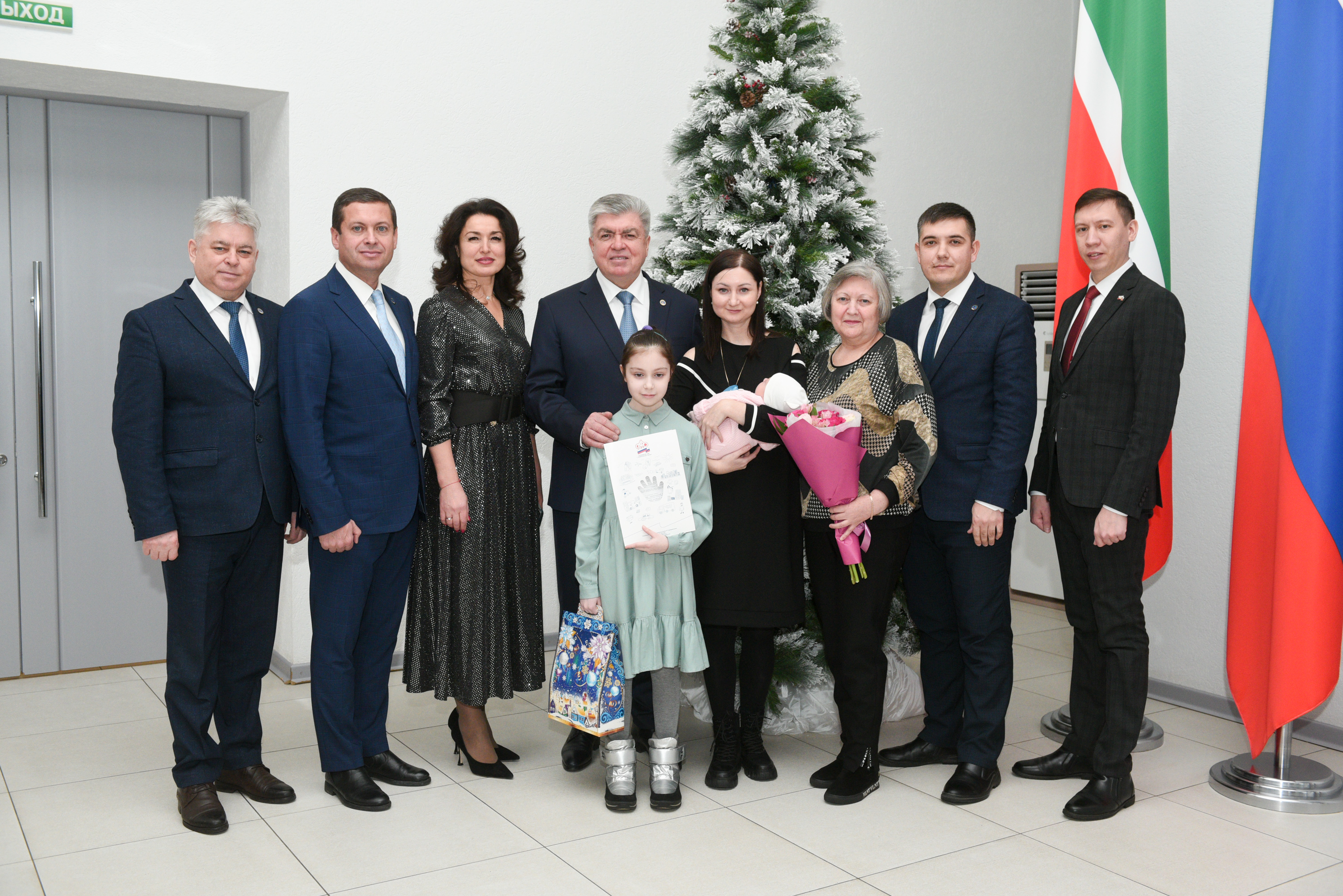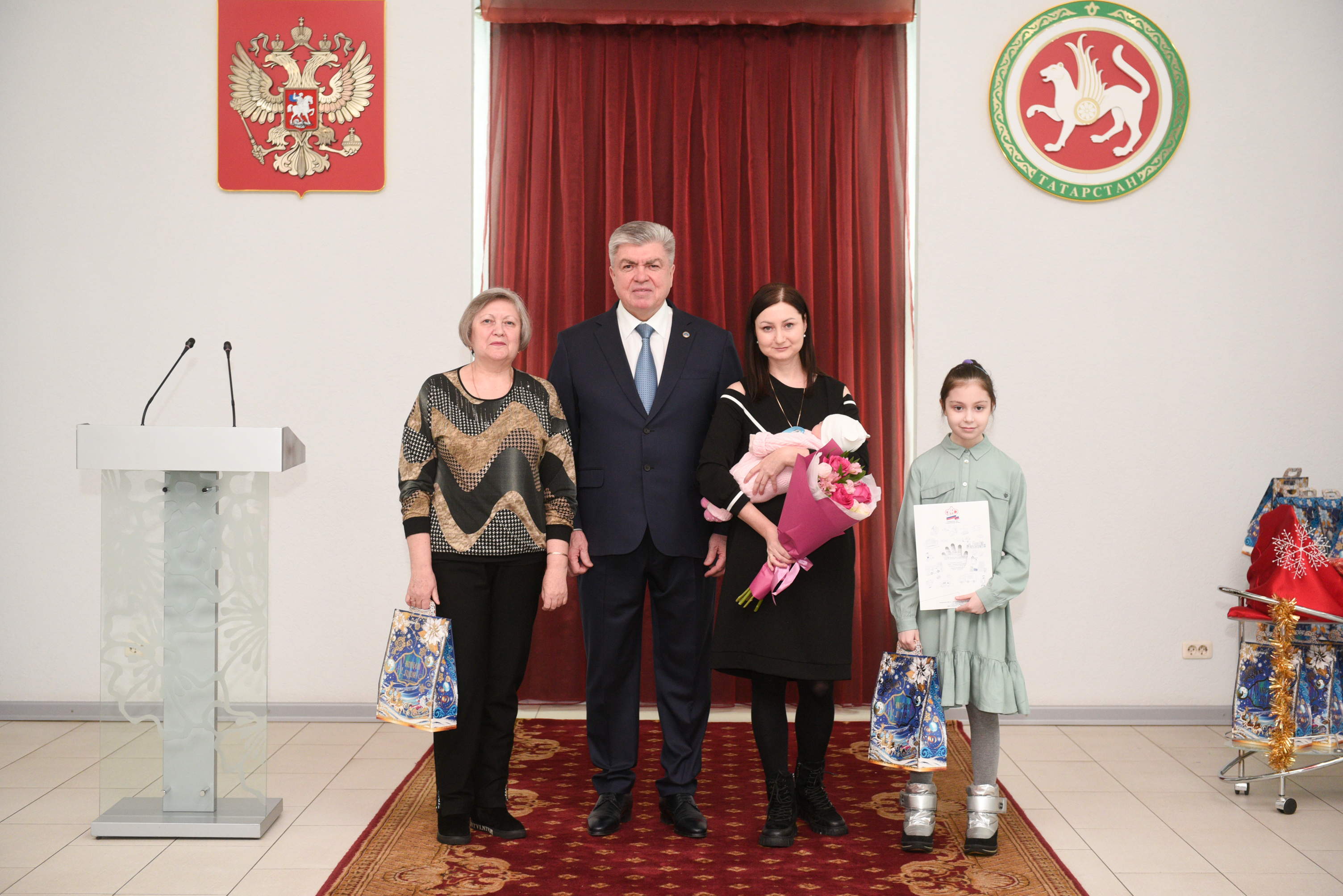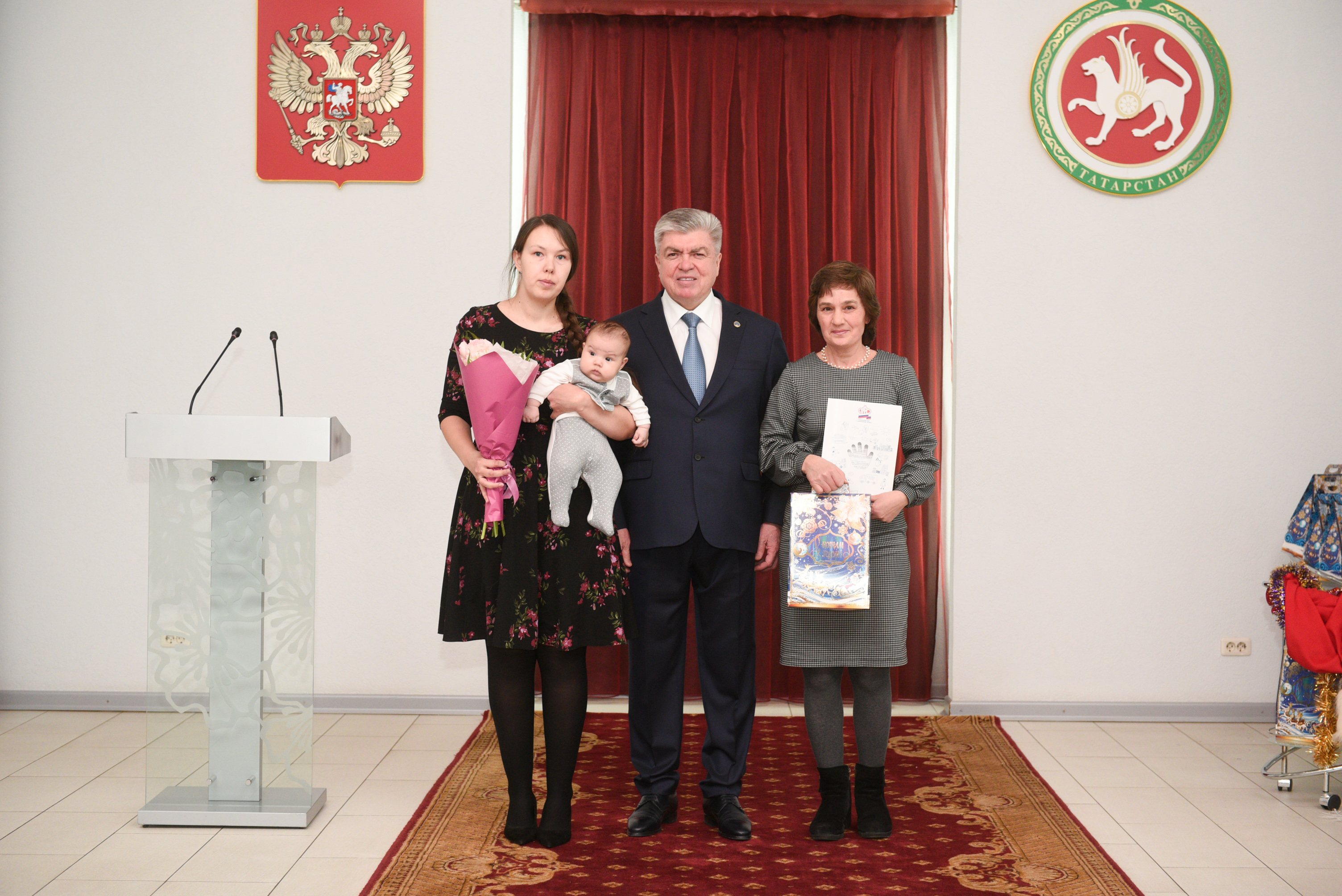 Сертификаты семьям и цветы молодым мамам вручил Наиль Магдеев. Без внимания не остались и детишки, им Дед Мороз и Снегурочка вручили сладкие подарки. Главы трёх районов города, а именно Фидарис Хабибуллин, Эдуард Фаттахов и Винер Харисов, присоединились к поздравлениям, побеседовали с семьями и узнали нужна ли им дополнительная поддержка.