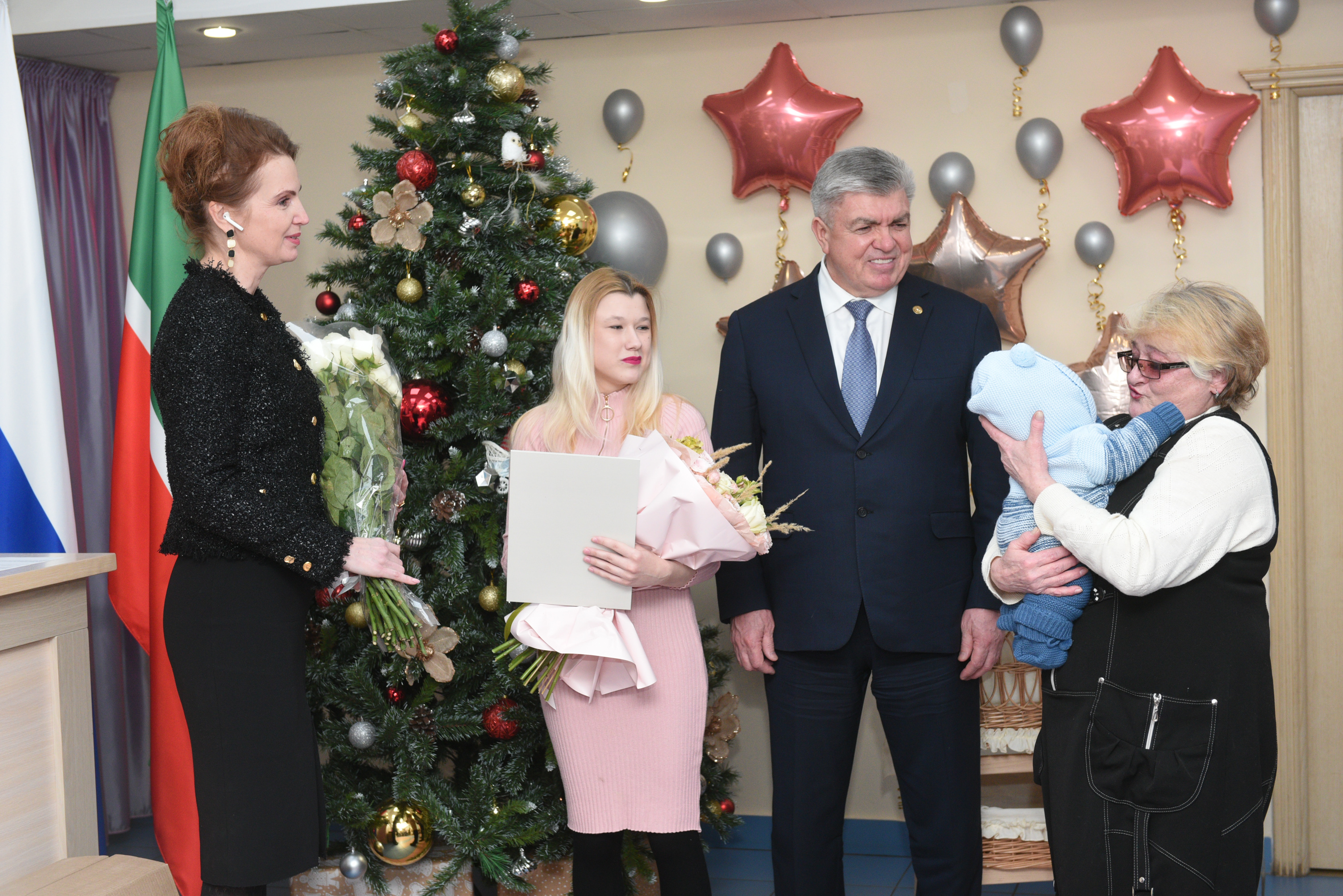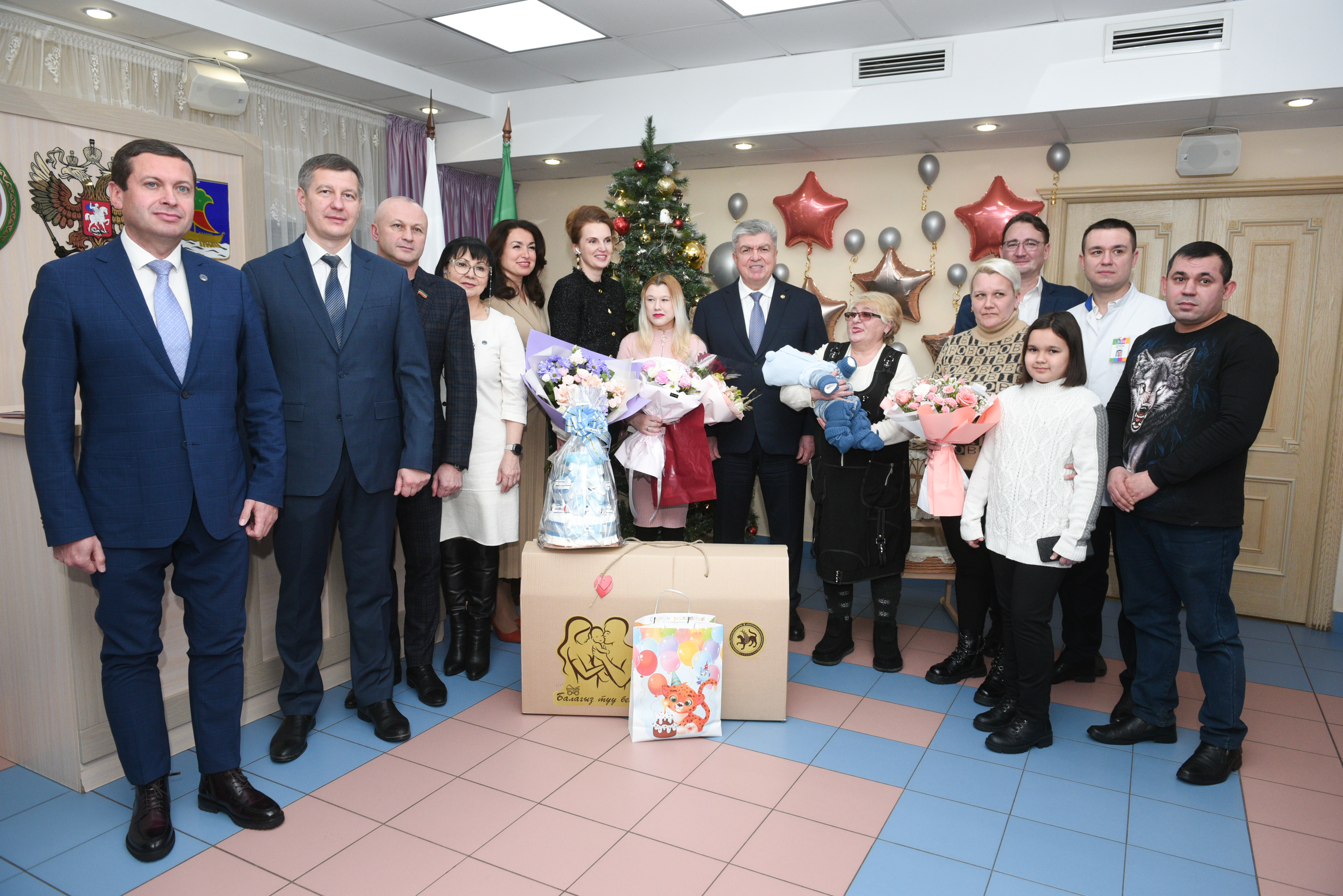 подарками и поздравлениями приехал мэр города Наиль Магдеев. Также с пополнением семью поздравили