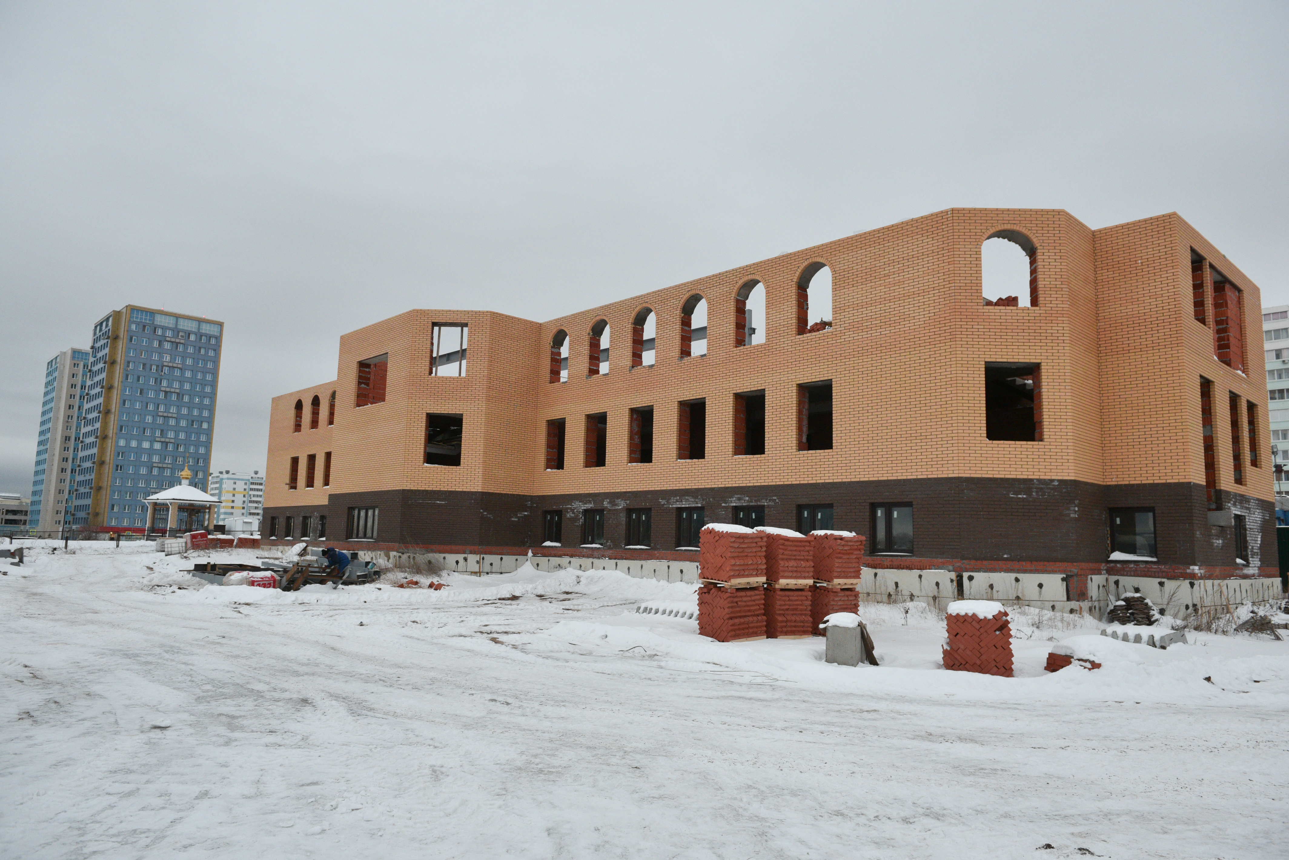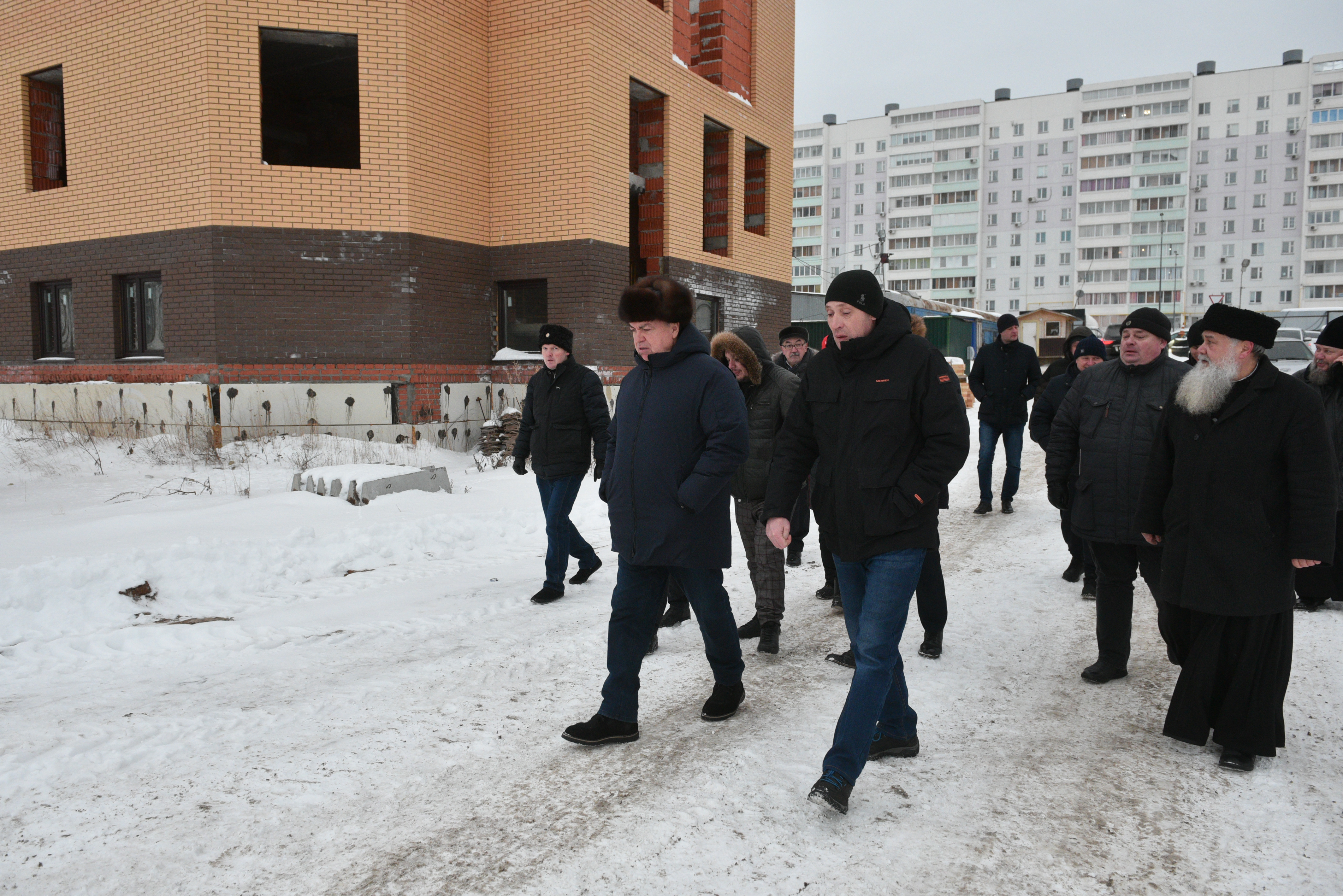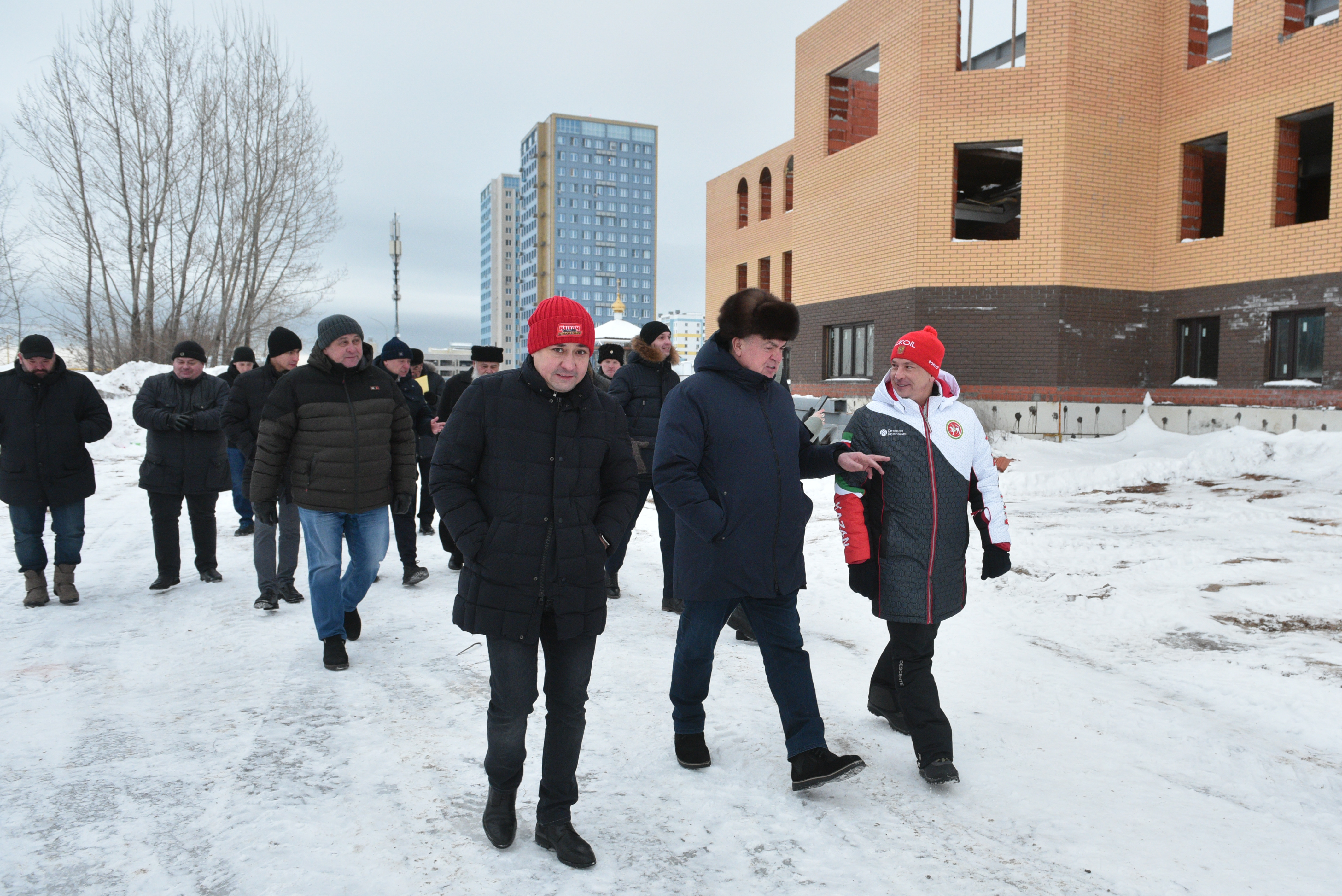 Продолжается строительство православной гимназии на территории прихода Святого Великомученика Георгия Победоносца. Сегодня ранним утром мэр города Наиль Магдеев выехал на место строительства, чтобы проверить ход работ. Также в ходе рабочего совещания участвовали руководители крупных строительных организаций города – Ильнар Гайсин и Алексей Горшков.