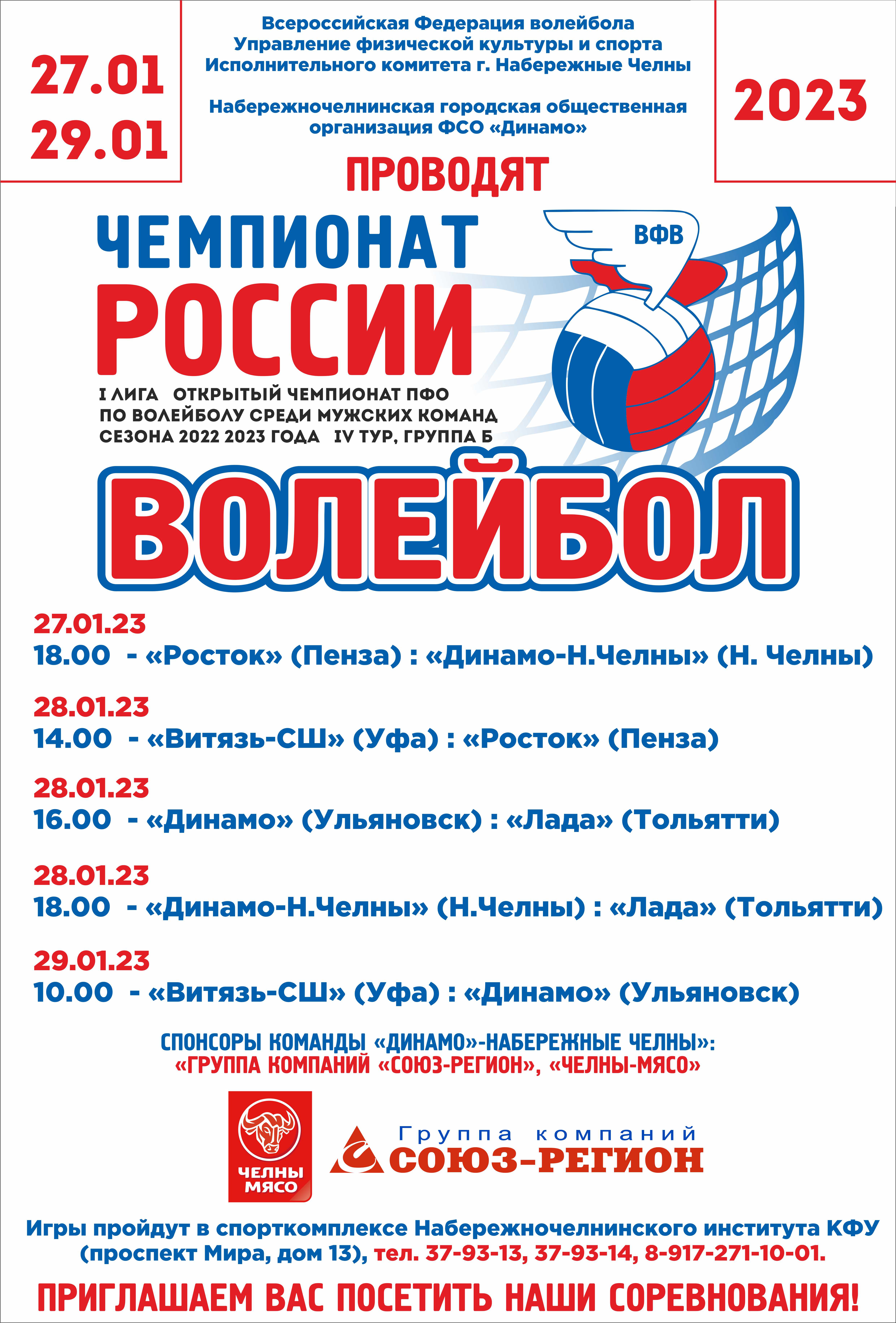 В Набережных Челнах пройдет IV тур Чемпионата России I лиги - Открытого чемпионата ПФО по волейболу среди мужских команд сезона 2022-2023гг. Игры пройдут с 27 по 29 января на базе спорткомплекса Набережночелнинского института КФУ (пр-т Мира, 13).