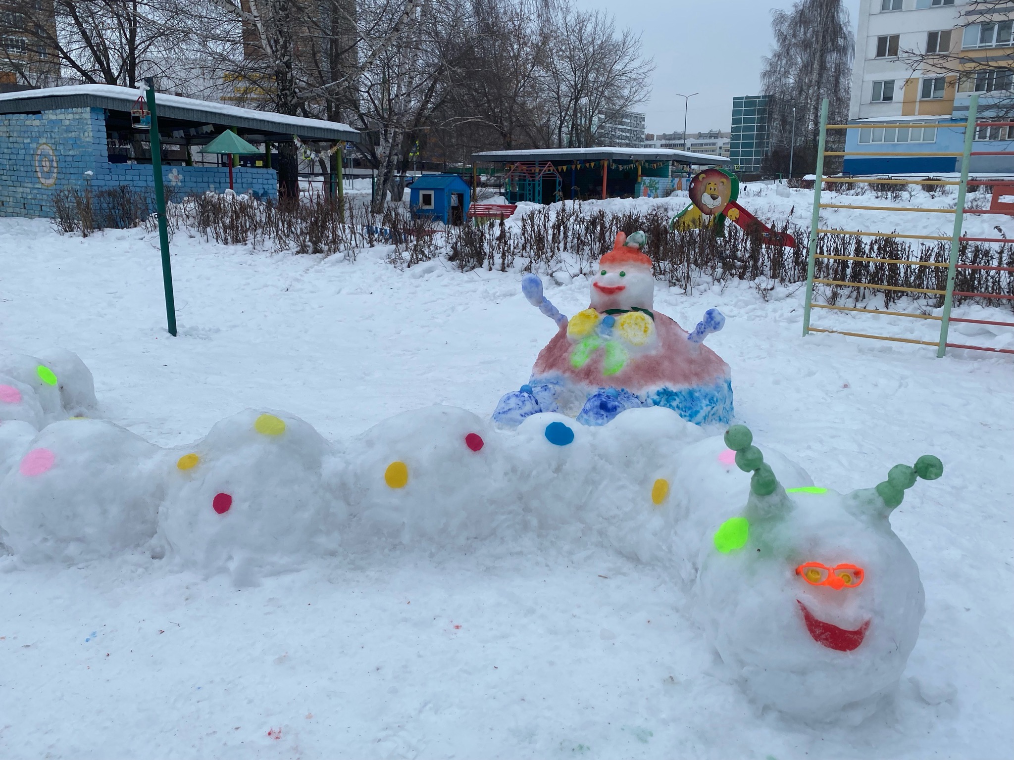 Между фигурками расположилась снежная горка и веселая гусеничка (дети катали снежные комки, поливали постройки из лейки водой), тигренок для метания, дорожка для скольжения ждут ребят на прогулке.