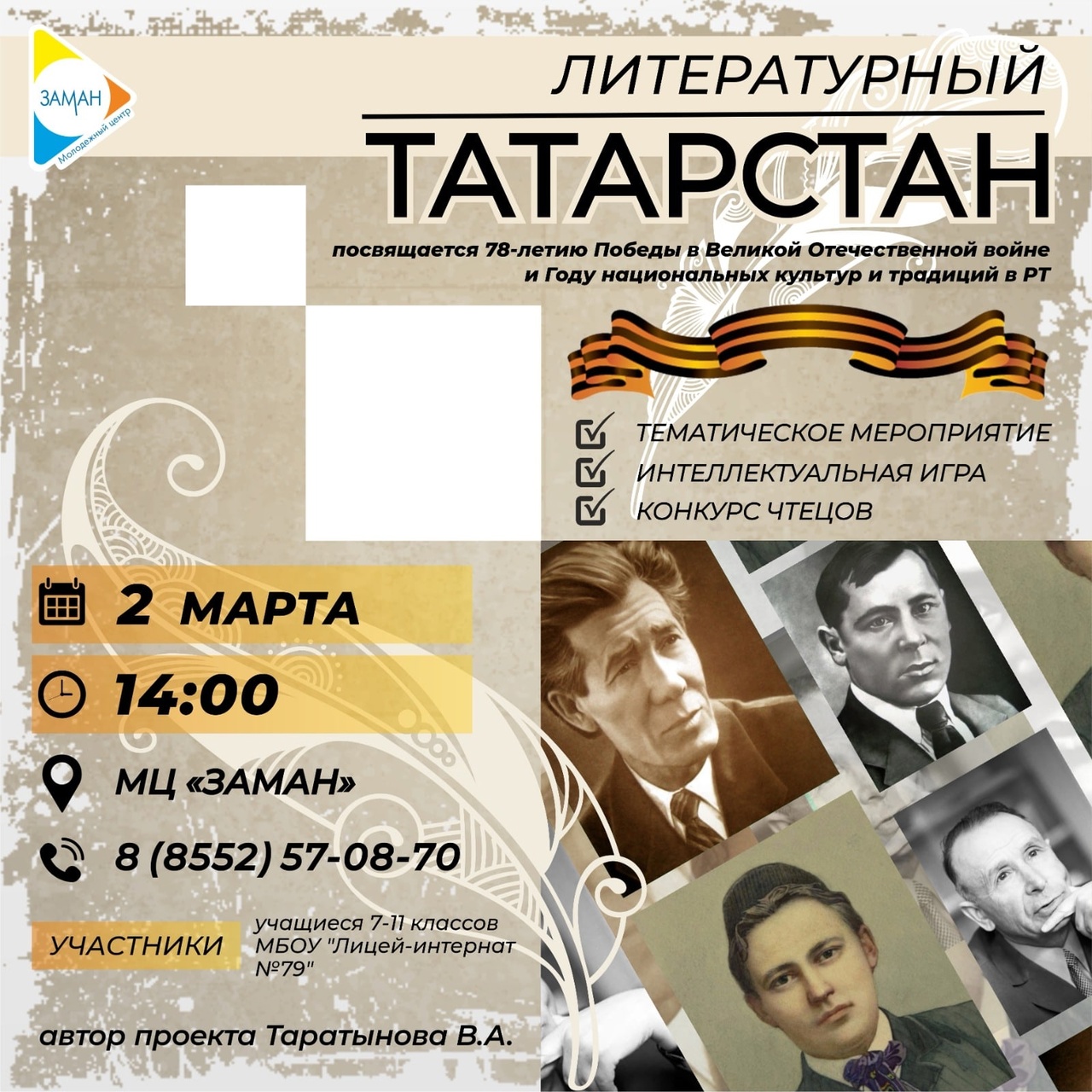 2 марта в молодёжном центре «Заман» состоится тематическое мероприятие с интеллектуальной игрой «Литературный Татарстан». Мероприятие посвящено 78-летию Победы в Великой Отечественной войне и Году национальных культур и традиций в Республике Татарстан, среди учащихся 7-11 классы лицея-интерната №79.