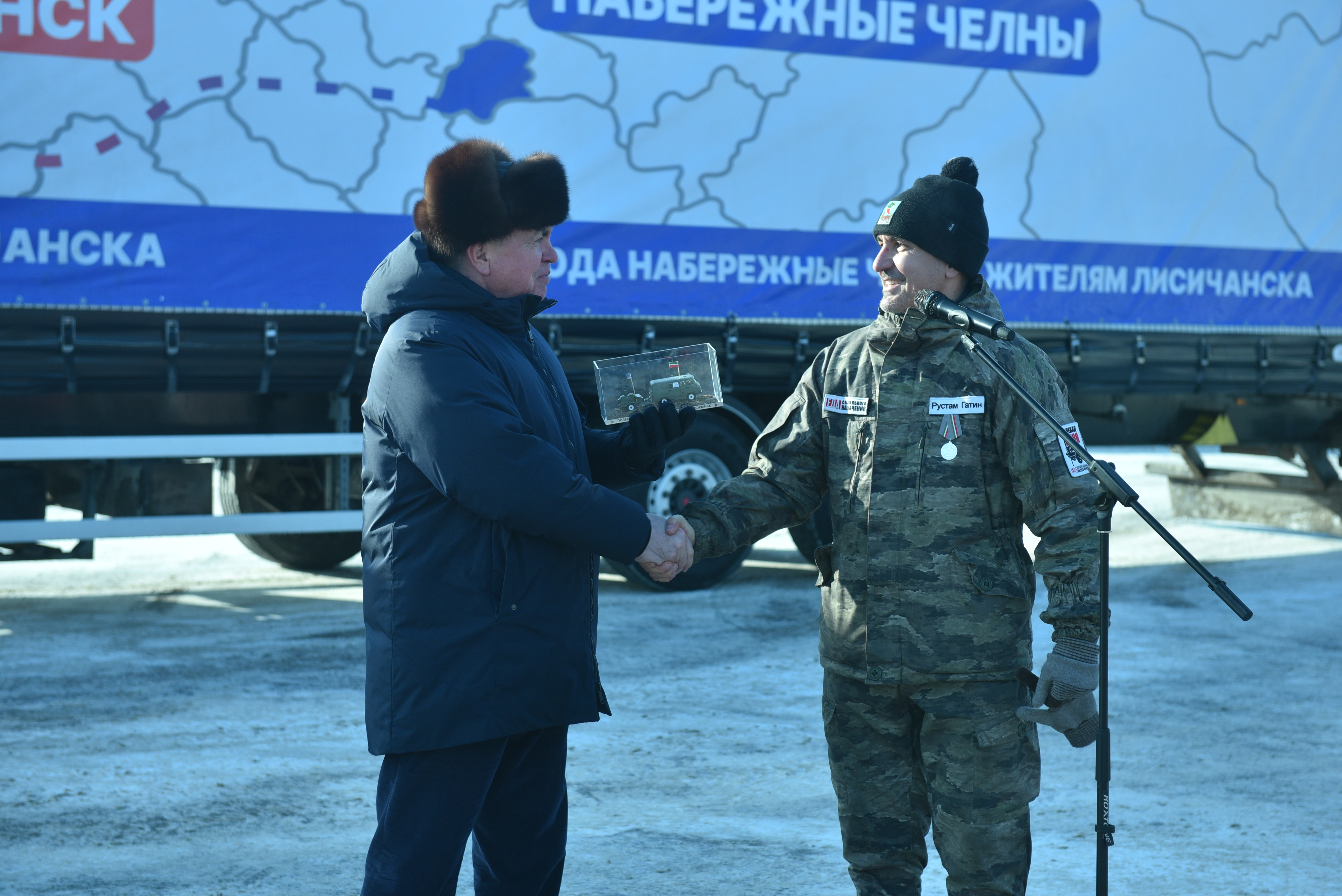 Мэр города Наиль Магдеев отметил, что гуманитарную миссию выполняют мужественные люди: «Для того, чтобы выполнять ее, нужно обладать добрым сердцем, стальным характером, – отметил он. – Мы регулярно отправляем продовольствие, чтобы команда могла там готовить еду для детей, стариков, обездоленных. Мы в нашем городе находим ресурсы, которые направляем на важное и богоугодное дело. Отправляем в добрый путь очередной груз: тушенку, одноразовую посуду, крупы. Этого хватит до апреля. Всем, кто принимал участие, большое спасибо – за помощь, сострадание».