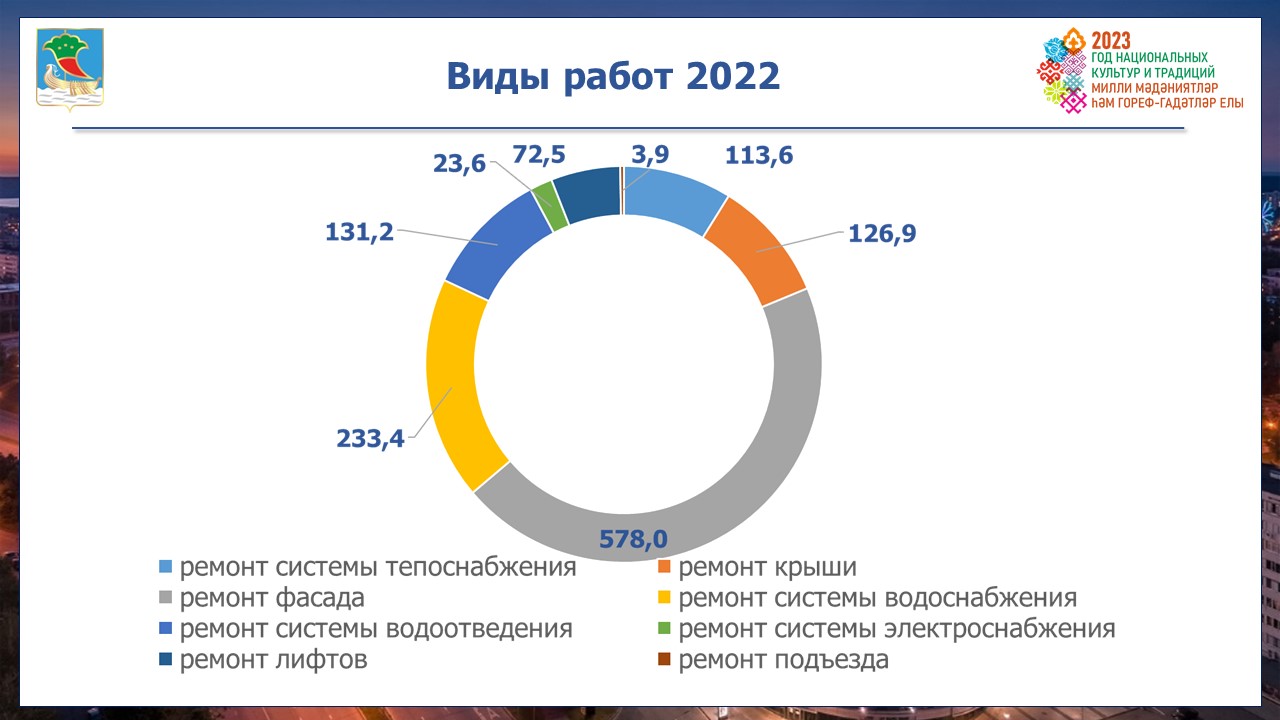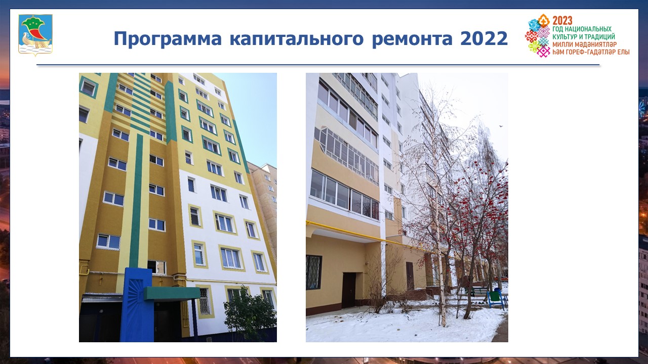 По программе капитального ремонта в 2023 году запланирован ремонт в 107 многоквартирных домах общей площадью 1 386 129,93 кв.м, в которых проживают более 51 тысяч человек. Объем финансирования составляет 1 млрд 388,3 млн рублей, из которых средства бюджета Республики Татарстан составляют 255,4 млн рублей, бюджета города – 267,3 млн рублей, средства собственников жилья – 852,1 млн рублей.