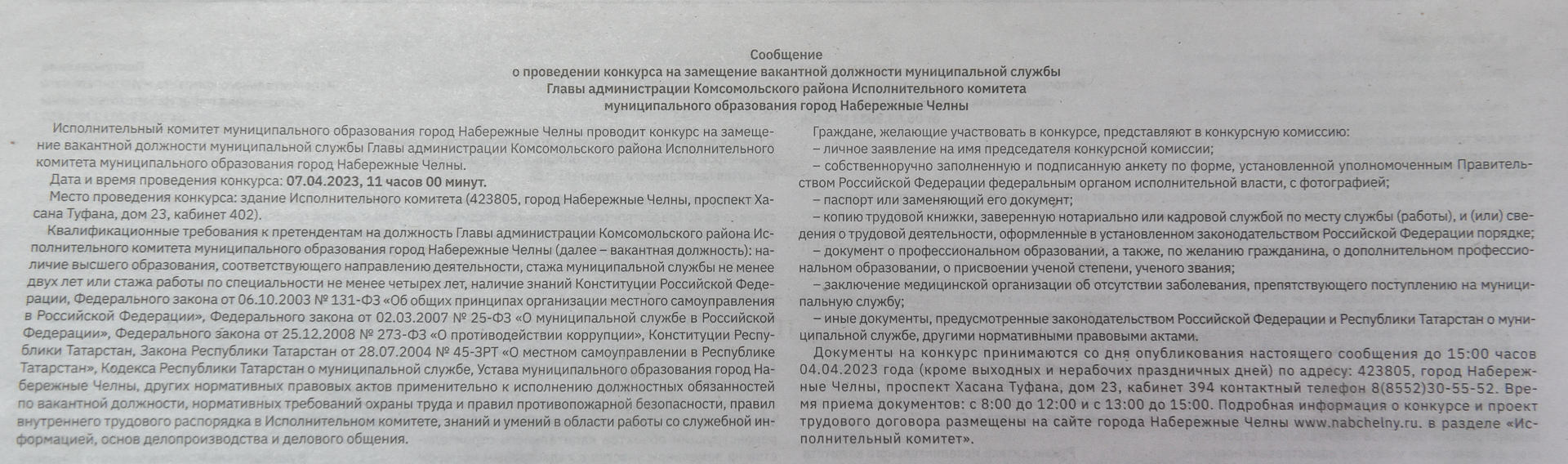 Исполнительный комитет муниципального образования город Набережные Челны проводит конкурс на замещение вакантной должности муниципальной службы главы администрации Комсомольского района Исполнительного комитета муниципального образования город Набережные Челны.