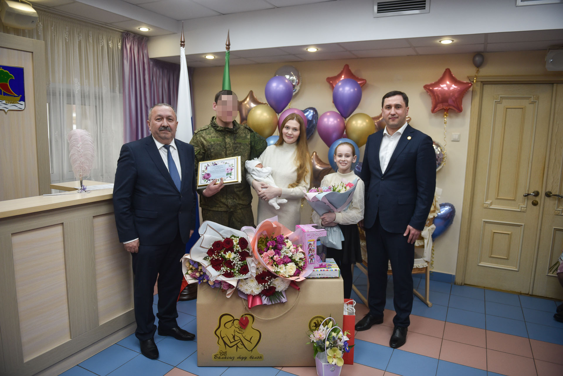 Присоединились к поздравлениям и коллеги Дениса Лаптева – мужчина был мобилизован с автомобильного завода ПАО «КАМАЗ». Заместитель генерального директора «КАМАЗ» по безопасности Сирень Галиакберов передал новоявленным родителям подарки, денежный сертификат от предприятия и высказал слова поддержки.
