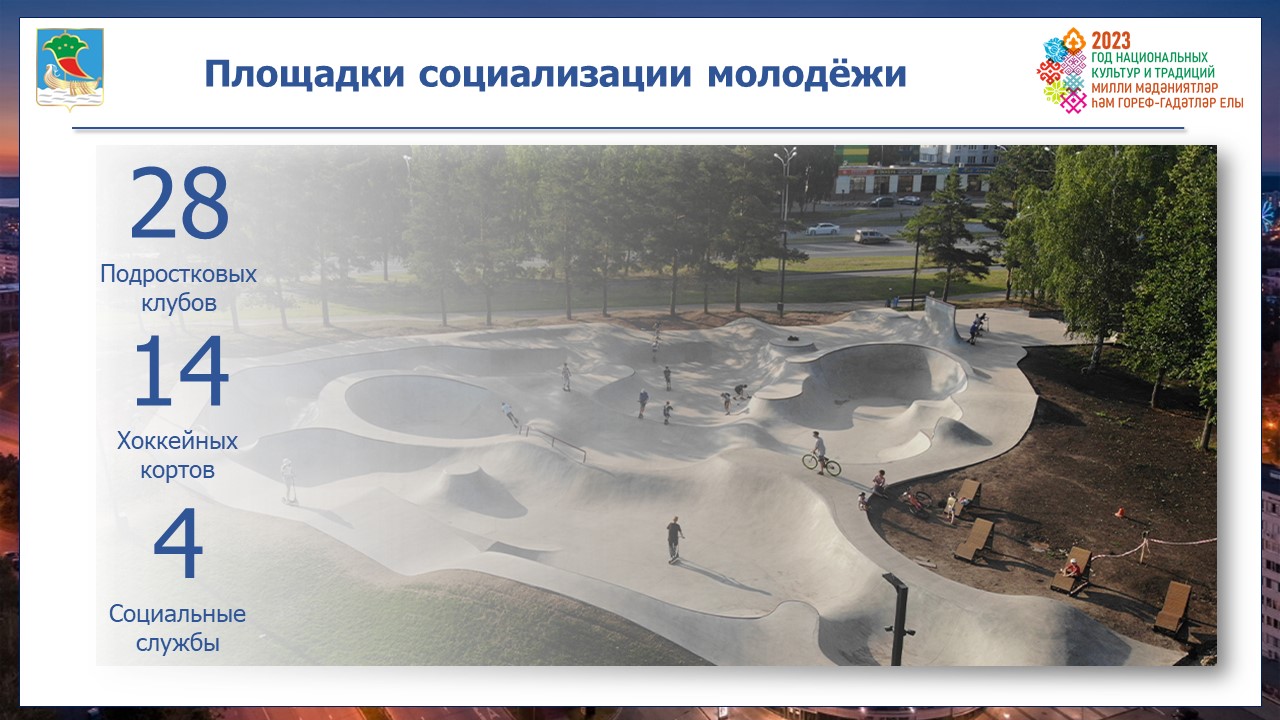 Также в городе работают 28 подростковых клубов в 28 комплексах, 14 хоккейных кортов и 32 команды, 4 социальных учреждения. Для всех молодых людей двери клубов открыты с 11:00 до 20:00. В 98 кружках и секциях на постоянной основе занимаются 3 330 человек.