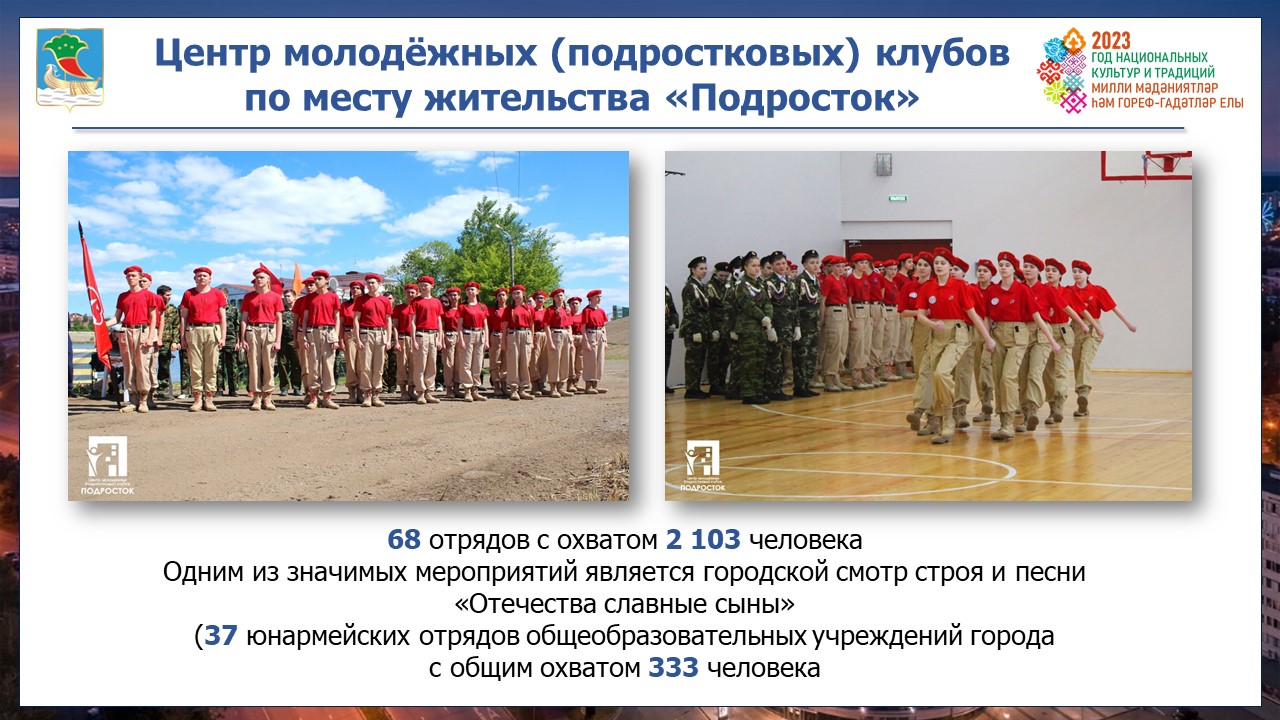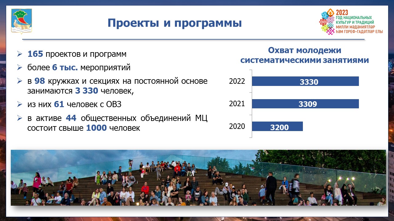 Город является одним из лучших в сфере молодежной политики Татарстана, ведь за 2022 год реализовано 165 проектов и 6 тысяч мероприятий с общим охватом более 300 тысяч человек. Всего в автограде 22 тысячи добровольцев.